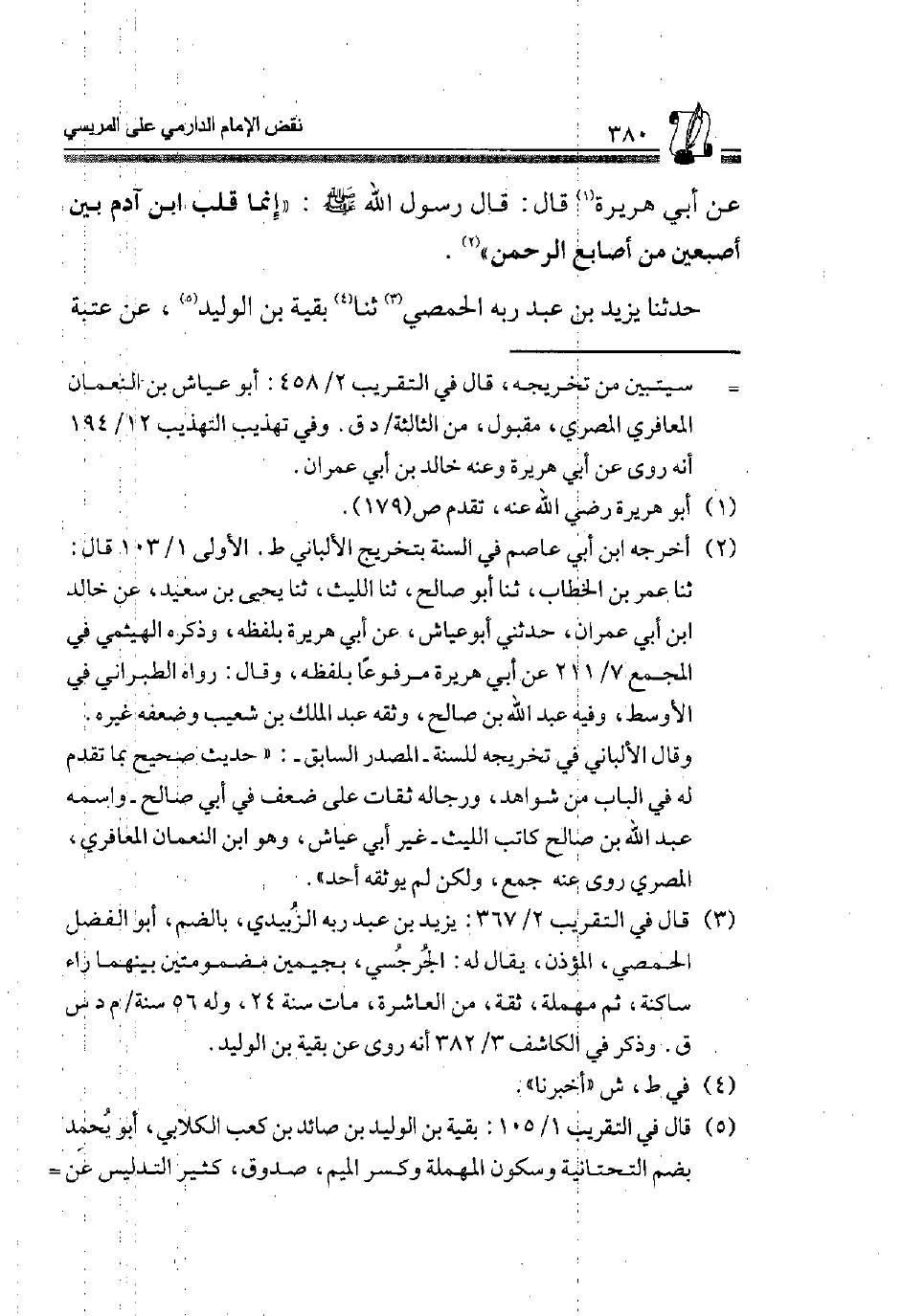 5 قَالَ فِي التَّقْرِيب 1/ 105: بَقِيَّة بن الْوَلِيد بن صائد بن كَعْب الْكلابِي، أَبُو يحمد بِضَم التَّحْتَانِيَّة وَسُكُون الْمُهْملَة وَكسر الْمِيم، صَدُوق، كثير التَّدْلِيس عَن الضُّعَفَاء، من الثَّامِنَة، مَاتَ سنة 97، وَله 87 سنة، خت م وَالْأَرْبَعَة، وَقَالَ فِي الْحَاشِيَة: الكلَاعِي، ينْسب إِلَى الكلاع بِفَتْح الْكَاف وَاللَّام المخففة قَبيلَة كَبِيرَة لنزلت حمص من الشَّام.
