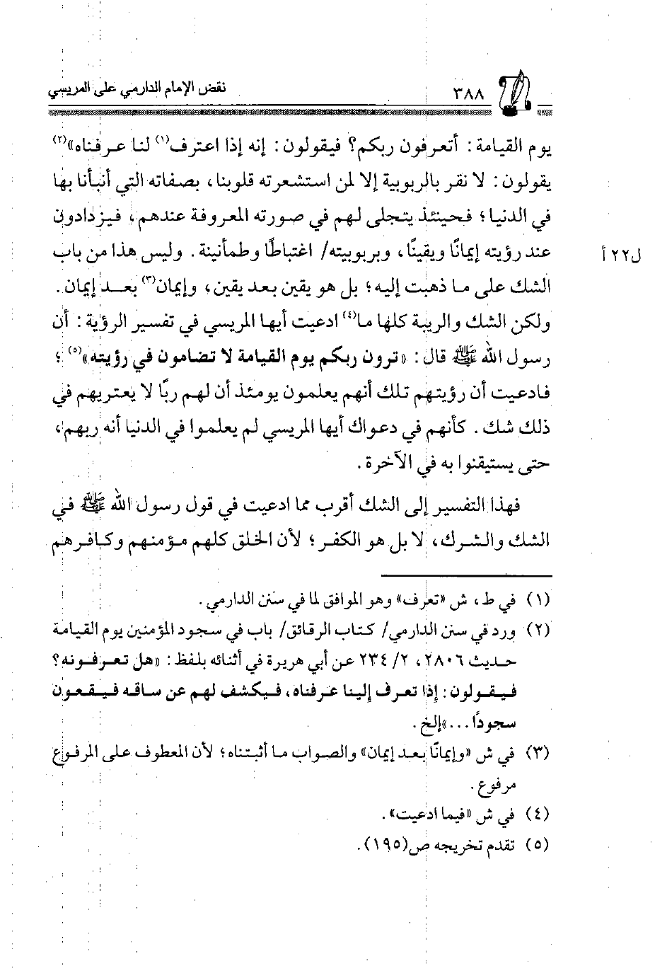 2 ورد فِي سنَن الدَّارمِيّ، كتاب الرَّقَائِق، بَاب فِي سجو، د عَن الْمُؤمنِينَ يَوْم الْقِيَامَة حَدِيث 2806، 2/ 234 عَن أبي هُرَيْرَة فِي أَثْنَائِهِ بِلَفْظ: "هَل تعرفونه؟ فَيَقُولُونَ: إِذا تعرف إِلَيْنَا عَرفْنَاهُ، فَيكْشف لَهُم عَن سَاقه فيقعون سجودًا ... " إِلَخ.