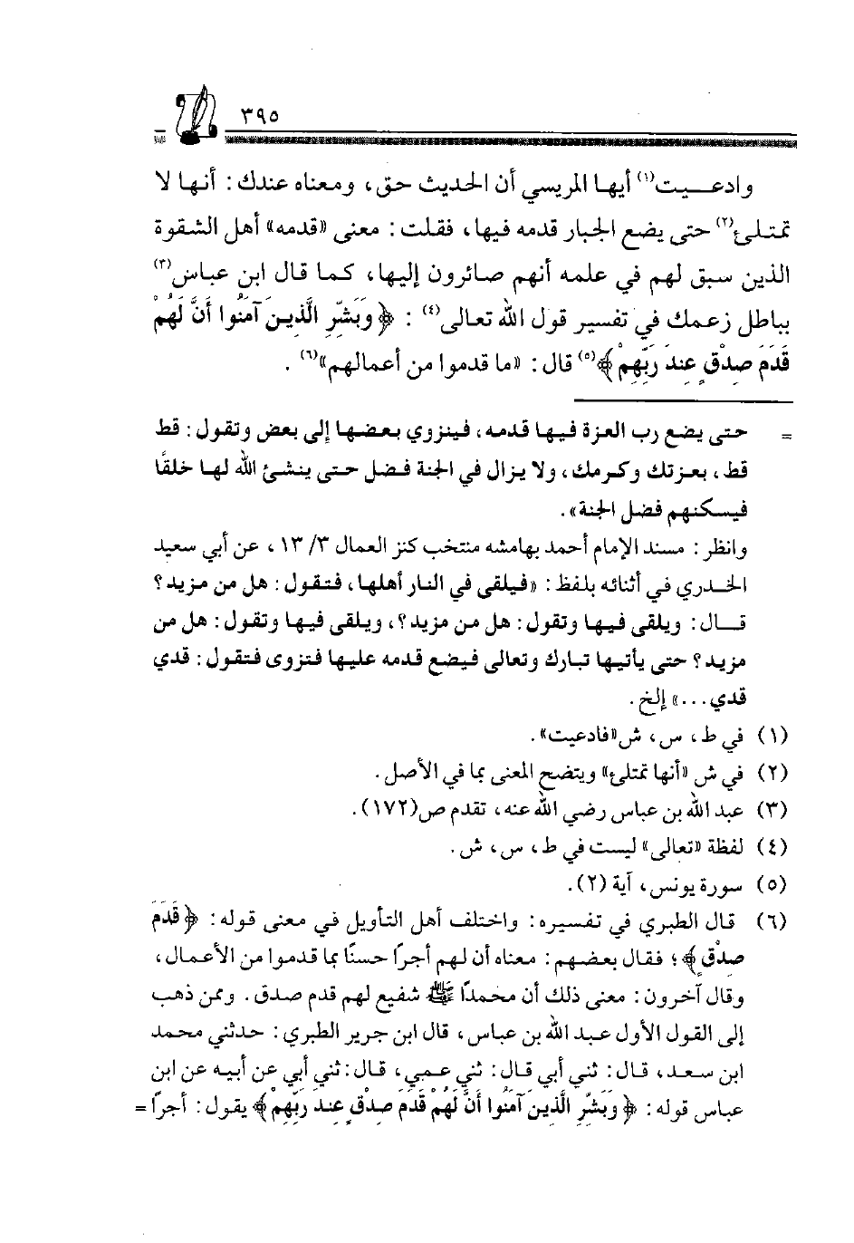 وَادَّعَيْتَ1 أَيُّهَا الْمَرِيسِيُّ أَنَّ الْحَدِيثَ حَقٌّ، وَمَعْنَاهُ عِنْدَكَ: أَنَّهَا لَا تَمْتَلِئُ2 حَتَّى يَضَعَ الْجَبَّارُ قَدَمَهُ فِيهَا، فَقُلْتَ: مَعْنَى "قَدَمَهُ" أَهْلُ الشِّقْوَةِ الَّذِينَ سَبَقَ لَهُمْ فِي عِلْمِهِ أَنَّهُمْ صَائِرُونَ إِلَيْهَا، كَمَا قَالَ ابْنُ عَبَّاسٍ3 بِبَاطِلِ زَعْمِكَ فِي تَفْسِيرِ قَوْلِ اللَّهِ تَعَالَى4: {وَبَشِّرْ الَّذِينَ آمَنُوا أَنَّ لَهُمْ قَدَمَ صِدْقٍ عِنْدَ رَبِّهِمْ} 5 قَالَ: "مَا قَدَّمُوا مِنْ أَعْمَالِهِمْ"6.