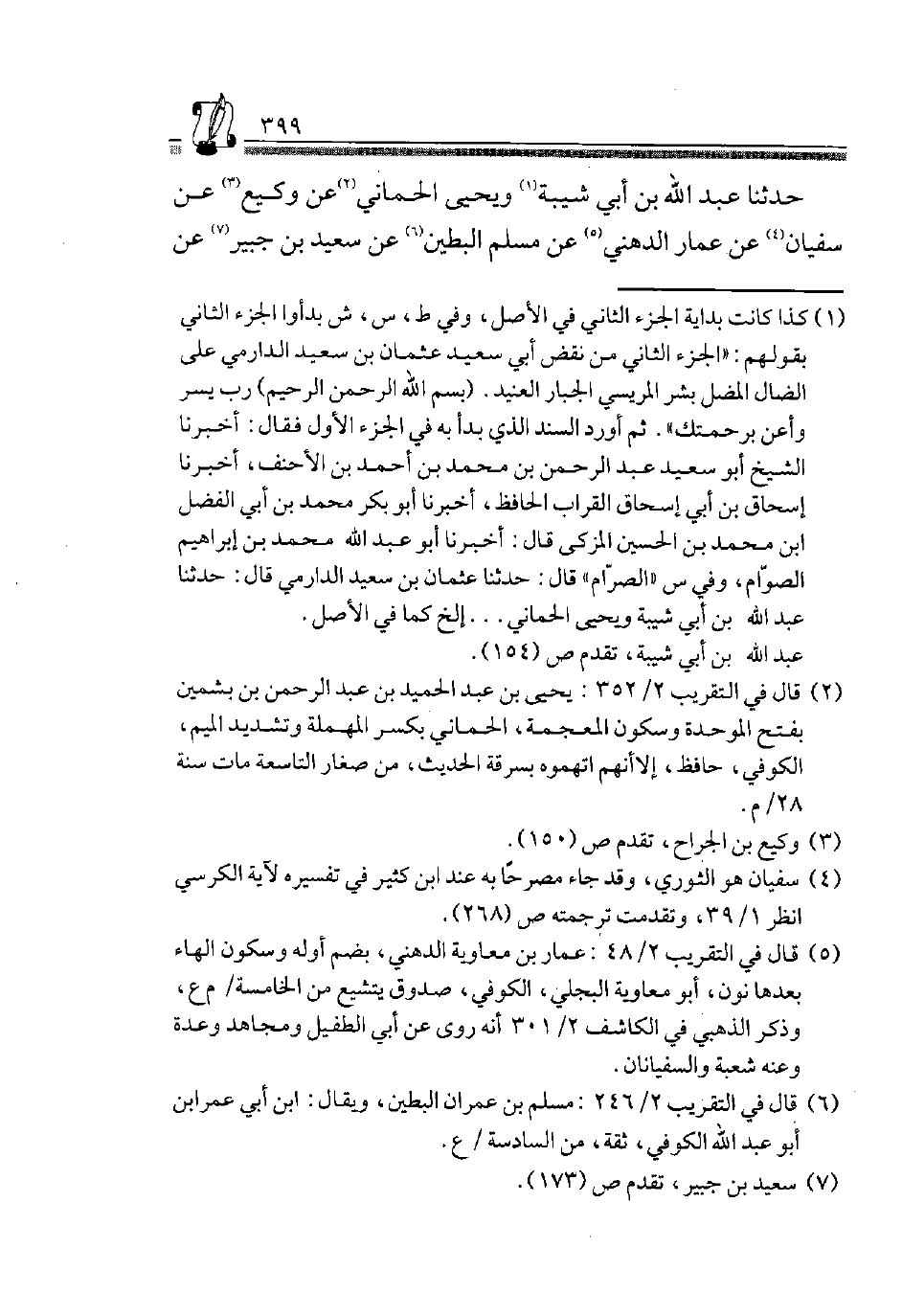 حَدَّثَنَا عَبْدُ اللَّهِ بْنُ أَبِي شَيْبَةَ1 وَيَحْيَى الْحِمَّانِيُّ2، عَنْ وَكِيعٍ3، عَنْ سُفْيَانَ4، عَنْ عَمَّارٍ الدُّهْنِيِّ5، عَنْ مُسْلِمٍ الْبَطِينِ6، عَنْ سَعِيدِ بن جُبَير7، عَن