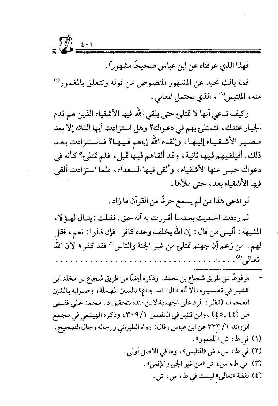 وَكَيف تَدعِي أَنَّهَا تَمْتَلِئُ حَتَّى يُلْقِيَ اللَّهُ فِيهَا الْأَشْقِيَاءَ الَّذِينَ هُمْ قَدَمُ الْجَبَّارِ عِنْدَكَ، فَتَمْتَلِئَ بِهِمْ فِي دَعْوَاكَ؟ وَهل استزادت بَعْدَ ذَلِكَ. أَفَيُلْقِيهُمْ فِيهَا ثَانِيَةً، وَقَدْ أَلْقَاهُمْ فِيهَا قَبْلُ، فَلَمْ تَمْتَلِئْ؟ كَأَنَّهُ فِي دَعْوَاكَ حَبَسَ عَنْهَا الْأَشْقِيَاءَ، وَأَلْقَى فِيهَا السُّعَدَاءَ، فَلَمَّا اسْتَزَادَتْ أَلْقَى فِيهَا الْأَشْقِيَاءَ بَعْدُ، حَتَّى مَلَأَهَا.