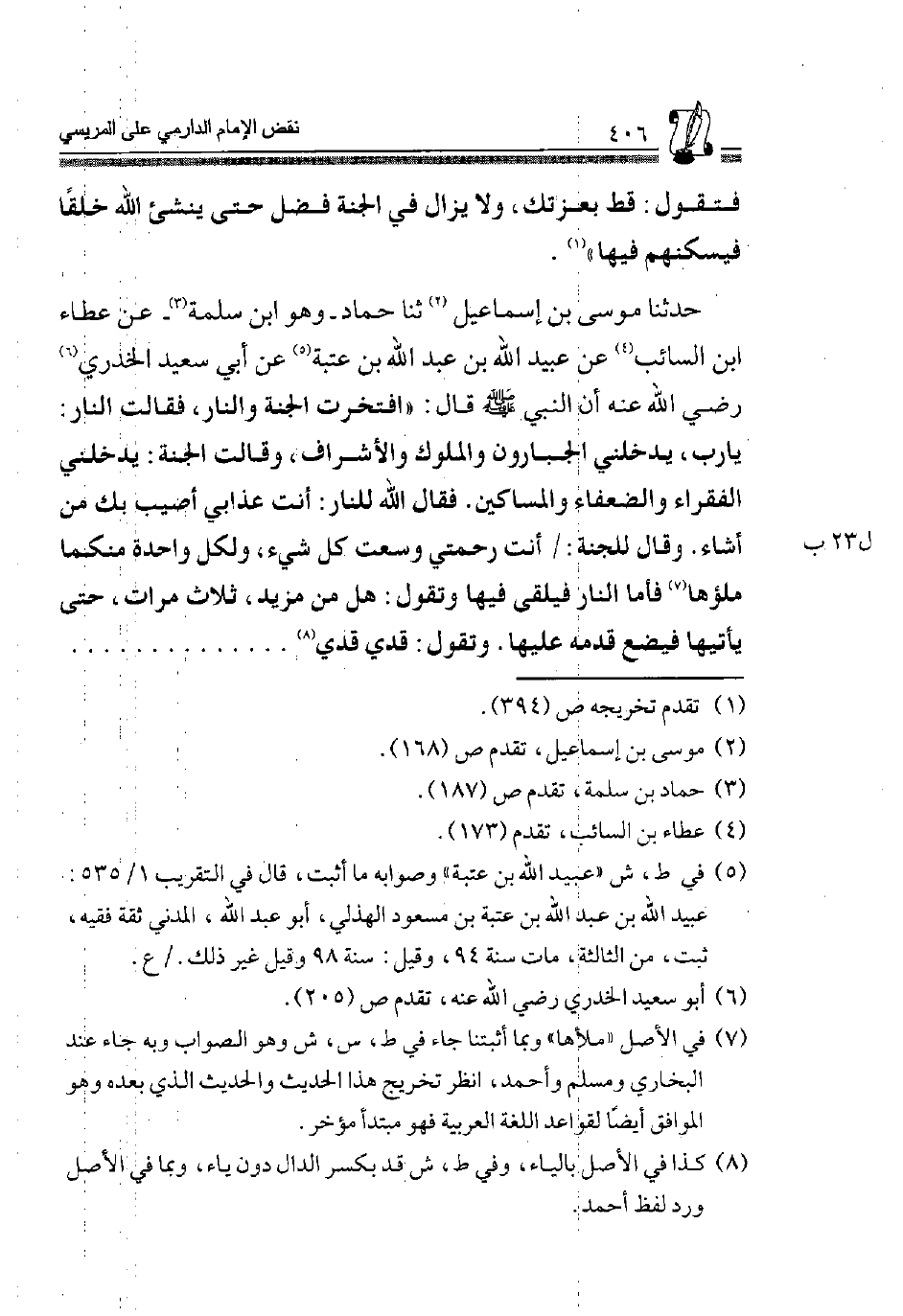 حَدَّثَنَا مُوسَى بْنُ إِسْمَاعِيلَ2، ثَنَا حَمَّادُ -وَهُوَ ابْنُ سَلَمَةَ3- عَنْ عَطَاءِ بْنِ السَّائِبِ4، عَنْ عُبَيْدِ اللَّهِ بْنِ عَبْدِ اللَّهِ بْنِ عُتْبَةَ5، عَنْ أَبِي سَعِيدٍ الْخُدْرِيِّ6 رَضِيَ اللَّهُ عَنْهُ أَنَّ النَّبِيَّ صَلَّى اللَّهُ عَلَيْهِ وَسَلَّمَ قَالَ: "افْتَخَرَتِ الْجَنَّةُ وَالنَّارُ، فَقَالَتِ النَّارُ: يارب يَدْخُلُنِي الْجَبَّارُونَ وَالْمُلُوكُ وَالْأَشْرَافُ، وَقَالَتِ الْجَنَّةُ: يَدْخُلُنِي الْفُقَرَاءُ وَالضُّعَفَاءُ وَالْمَسَاكِينُ. فَقَالَ اللَّهُ لِلنَّارِ: أَنْتِ عَذَابِي أُصِيبُ بِكِ مَنْ أَشَاءُ وَقَالَ لِلْجَنَّةِ: أَنْتِ رَحْمَتِي وَسِعْتِ كُلَّ شَيْءٍ، وَلِكُلِّ وَاحِدَةٍ مِنْكُمَا مِلْؤُهَا 7 فَأَمَّا النَّارُ فَيُلْقَى فِيهَا وَتَقُولُ: هَلْ مِنْ مَزِيدٍ، ثَلَاثَ مَرَّاتٍ، حَتَّى يأيتها فَيَضَعَ قَدَمَهُ عَلَيْهَا. وَتَقُولُ: قَدِي قدي 8...........................