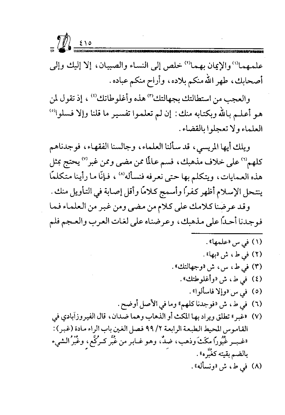 والعجيب مِنِ اسْتِطَالَتِكَ بِجَهَالَتِكَ3 هَذِهِ وَأُغْلُوطَاتِكَ4، إِذْ تَقول لمن هُوَ أَعْلَمُ بِاللَّهِ وَبِكِتَابِهِ مِنْكَ: إِنْ لَمْ تَعْلَمُوا تَفْسِيرَ مَا قُلْنَا وَإِلَّا فَسَلُوا5 الْعلمَاء ولاتعجلوا بِالْقَضَاءِ.
