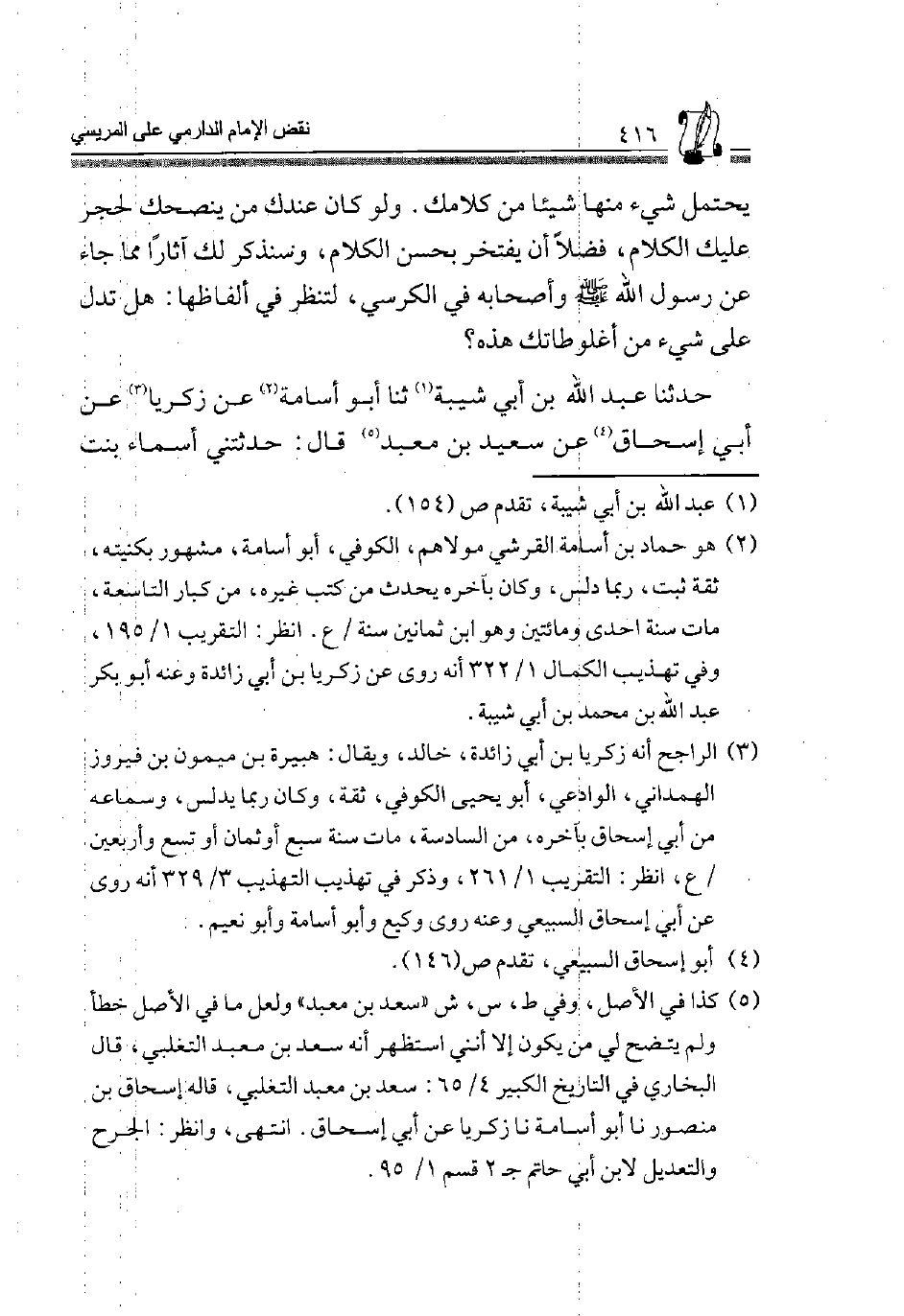 2 هُوَ حَمَّاد بن أُسَامَة الْقرشِي مَوْلَاهُم، الْكُوفِي، أَبُو أُسَامَة، مَشْهُور بكنيته ثِقَة ثَبت، رُبمَا دلّس، وَكَانَ بِآخِرهِ يحدث من كتب غَيره، وَكَانَ من كبار التَّاسِعَة مَاتَ سنة احدى وَمِائَتَيْنِ وَهُوَ ابْن ثَمَانِينَ سنة، ع. انْظُر: التَّقْرِيب 1/ 195، وَفِي تَهْذِيب الْكَمَال 1/ 322 أَنه روى عَنْ زَكَرِيَّا بْنِ أَبِي زَائِدَةَ وَعنهُ أَبُو بكر عبد الرَّحْمَن بن أبي شيبَة.