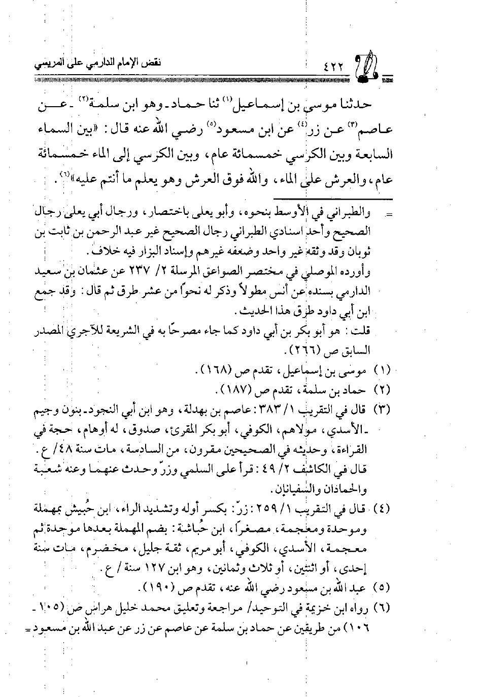 6 رَوَاهُ ابْن خُزَيْمَة فِي التَّوْحِيد، مُرَاجعَة وَتَعْلِيق مُحَمَّد خَلِيل هراس ص"105-106" من طَرِيقين عَنْ حَمَّادِ بْنِ سَلَمَةَ، عَنْ عَاصِمٍ، عَنْ زِرٍّ، عَنْ عَبْدِ الله بن مَسْعُود =