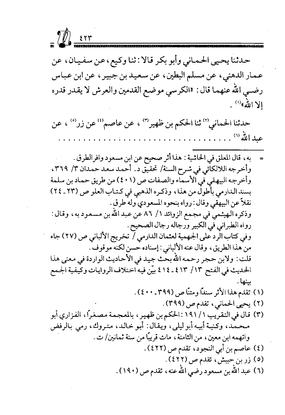 حَدَّثَنَا يَحْيَى الْحِمَّانِيُّ وَأَبُو بَكْرٍ قَالَا: ثَنَا وَكِيعٌ، عَنْ سُفْيَانَ، عَنْ عَمَّارٍ الدُّهْنِيِّ، عَنْ مُسْلِمٍ الْبَطِينِ، عَنْ سَعِيدِ بْنِ جُبَيْرٍ، عَنِ ابْنِ عَبَّاسٍ رَضِيَ اللَّهُ عَنْهُمَا قَالَ: "الْكُرْسِيُّ مَوْضِعُ الْقَدَمَيْنِ وَالْعَرْشُ لَا يُقَدِّرُ قَدْرَهُ إِلَّا اللَّهُ"1.