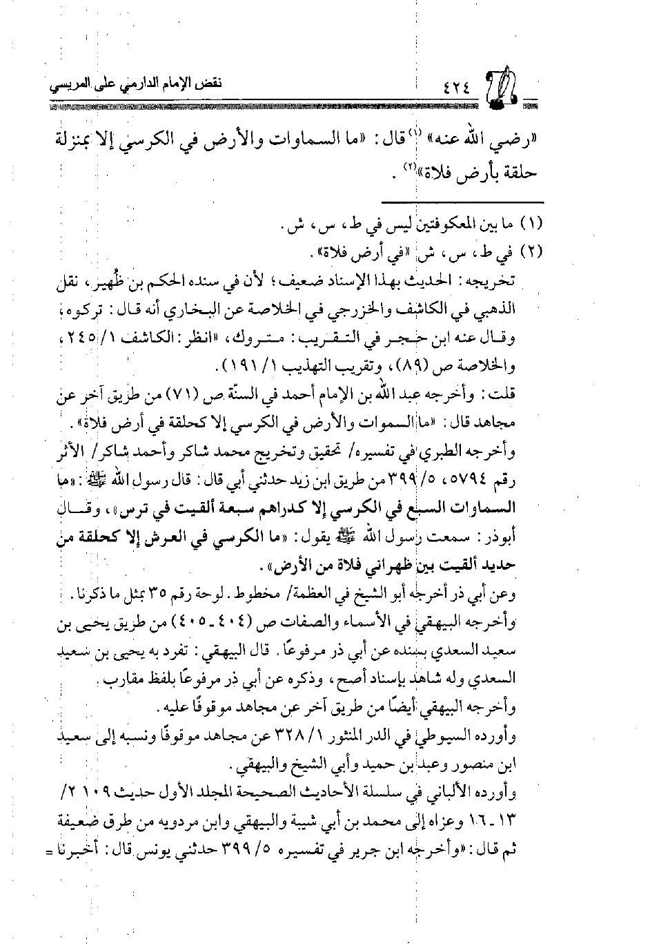 وَأخرجه الطَّبَرِيّ فِي تَفْسِيره، تَحْقِيق وَتَخْرِيج مُحَمَّد شَاكر وَأحمد شَاكر، الْأَثر رقم 5794، 5/ 399 من طَرِيق ابْن زيد حَدثنِي أبي قَالَ: قَالَ رَسُولُ اللَّهِ صَلَّى الله عَلَيْهِ وَسلم: "مَا السَّمَاوَات السَّبع فِي الْكُرْسِيّ إِلَّا كدراهم سَبْعَة ألقيت فِي ترس" وَقَالَ أَبُو ذَر: سَمِعْتُ رَسُولَ اللَّهِ صَلَّى اللَّهُ عَلَيْهِ وَسلم يَقُول: "مَا الْكُرْسِيّ فِي الْعَرْش إِلَّا كحلقة من حَدِيد ألقيت بَين ظهراني فلاة من الأَرْض".