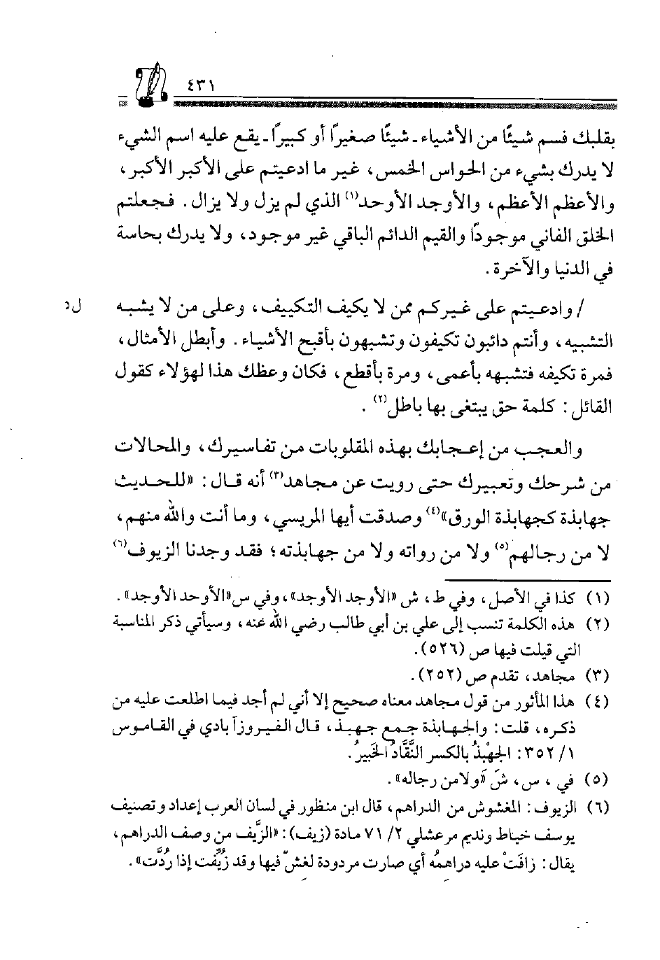 وَالْعَجَبُ مِنْ إعجابك بِهَذِهِ المقلوبات من تفاسيرك، وَالْمُحَالَاتِ مِنْ شَرْحِكَ وَتَعْبِيرِكَ حَتَّى رَوَيْتَ عَنْ مُجَاهِدٍ3 أَنَّهُ قَالَ: لِلْحَدِيثِ جَهَابِذَةُ كَجَهَابِذَةِ الْوَرِقِ"4 وَصَدَقْتَ أَيُّهَا الْمَرِيسِيُّ، وَمَا أَنْتَ وَاللَّهِ مِنْهُمْ، لَا مِنْ رِجَالِهِمْ5 وَلَا مِنْ رُوَاتِهِ وَلَا مِنْ جَهَابِذَتِهِ، فَقَدْ وَجَدْنَا الزُّيُوفَ6 عِنْدَكَ7 جَائِزَةً نَقَّادَةً8، وَالنَّقَادَةَ نَفَايَةً9، فَكَيْفَ تَسْتَطِيلُ بمعرفتها، وَأَنت المنسلخ عَنْهَا؟