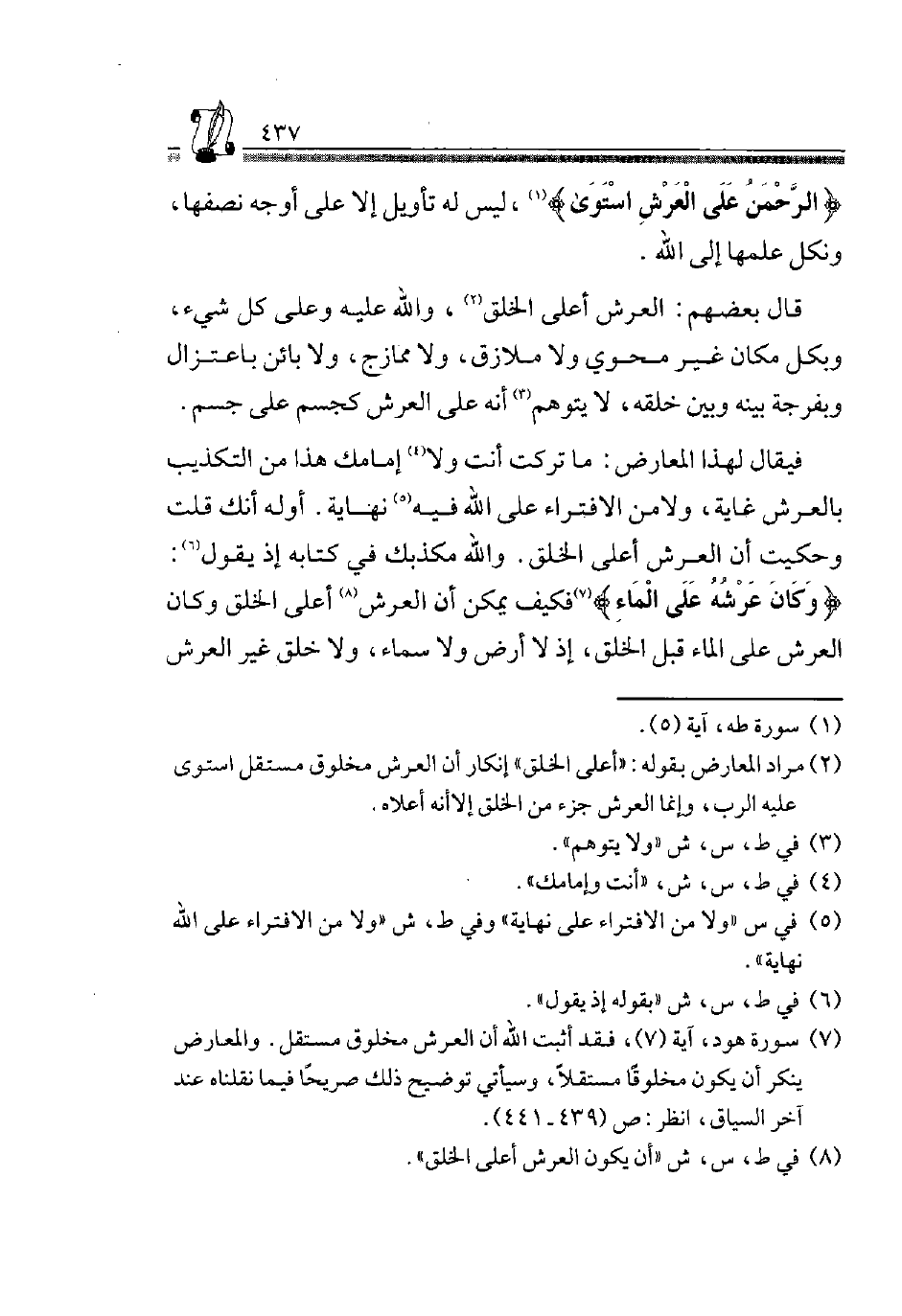 7 سُورَة هود، آيَة "7"، فقد أثبت الله أَن الْعَرْش مَخْلُوق مُسْتَقل. الْمعَارض يُنكر أَن يكون مخلوقًا مستقلًّا، وَسَيَأْتِي توضيح ذَلِك صَرِيحًا فِيمَا نَقَلْنَاهُ عِنْد آخر السِّيَاق، انْظُر: ص”439-441".