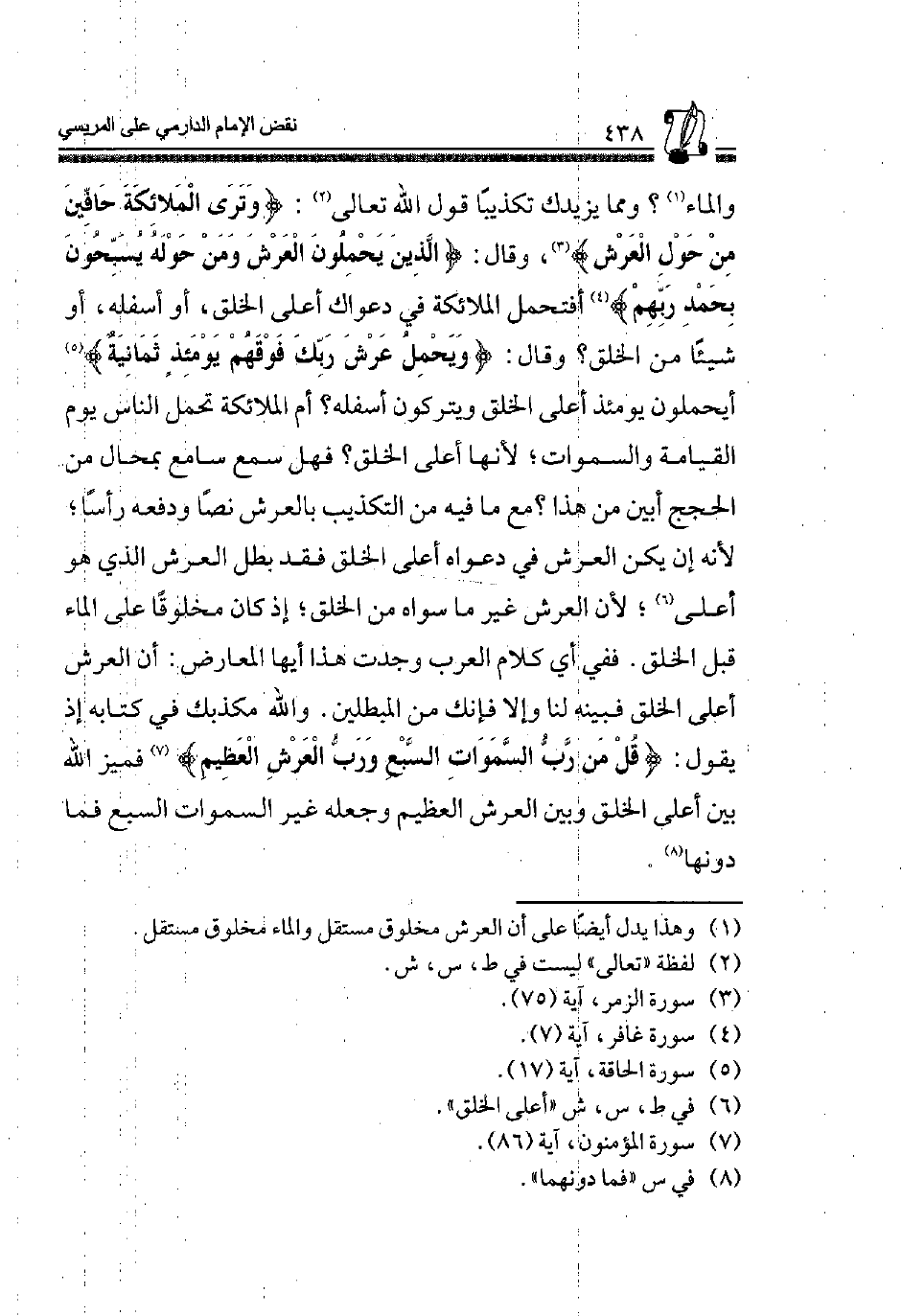 وَالْمَاءِ1؟ وَمِمَّا يَزِيدُكَ تَكْذِيبًا قَوْلُ اللَّهِ تَعَالَى2: {وَتَرَى الْمَلائِكَةَ حَافِّينَ مِنْ حَوْلِ الْعَرْشِ} 3 وَقَالَ: {الَّذِينَ يَحْمِلُونَ الْعَرْشَ وَمَنْ حَوْلَهُ يُسَبِّحُونَ بِحَمْدِ رَبِّهِمْ} 4 أَفَتَحْمِلُ الْمَلَائِكَةُ فِي دَعْوَاكَ أَعْلَى الْخَلْقِ، أَوْ أَسْفَلَهُ، أَوْ شَيْئًا مِنَ الْخَلْقِ؟ وَقَالَ: {وَيَحْمِلُ عَرْشَ رَبِّكَ فَوْقَهُمْ يَوْمَئِذٍ ثَمَانِيَةٌ} 5 أَيَحْمِلُونَ يَوْمَئِذٍ أَعْلَى الْخَلْقِ وَيَتْرُكُونَ أَسْفَلَهُ؟ أَمِ الْمَلَائِكَةُ تَحْمِلُ النَّاسَ يَوْم الْقِيَامَة وَالسَّمَوَات؛ لِأَنَّهَا أعلا الْخَلْقِ؟ فَهَلْ سَمِعَ سَامِعٌ بِمُحَالٍ مِنَ الْحُجَجِ أَبْيَنَ مِنْ هَذَا؟ مَعَ مَا فِيهِ مِنَ التَّكْذِيبِ بِالْعَرْشِ نَصًّا وَدَفْعِهُ رَأْسًا؛ لِأَنَّهُ إِنْ يَكُنِ الْعَرْشُ فِي دَعْوَاهُ أَعْلَى الْخَلْقِ فَقَدْ بَطُلَ الْعَرْشُ الَّذِي هُوَ أَعْلَى6؛ لِأَنَّ الْعَرْشَ غَيْرُ مَا سِوَاهُ مِنَ الْخَلْقِ، إِذْ كَانَ مَخْلُوقًا عَلَى الْمَاءِ قَبْلَ الْخَلْقِ، فَفِي أَيِّ كَلَامِ الْعَرَبِ، وَجَدْتَ هَذَا أَيُّهَا الْمُعَارِضُ: أَنَّ الْعَرْشَ أَعْلَى الْخَلْقِ فَبَيِّنْهُ لَنَا وَإِلَّا فَإِنَّكَ مِنَ الْمُبْطِلِينَ. وَاللَّهُ مُكَذِّبُكَ فِي كِتَابِهِ إِذْ يَقُولُ: {قُلْ مَنْ رَبُّ السَّمَوَاتِ السَّبْعِ وَرَبُّ الْعَرْشِ الْعَظِيمِ} 7 فَمَيَّزَ اللَّهُ بَيْنَ أَعْلَى الْخَلْقِ وَبَيْنَ الْعَرْشِ الْعَظِيمِ وَجَعَلَهُ غَيْرَ السَّمَوَات السَّبع فَمَا دونهَا8.