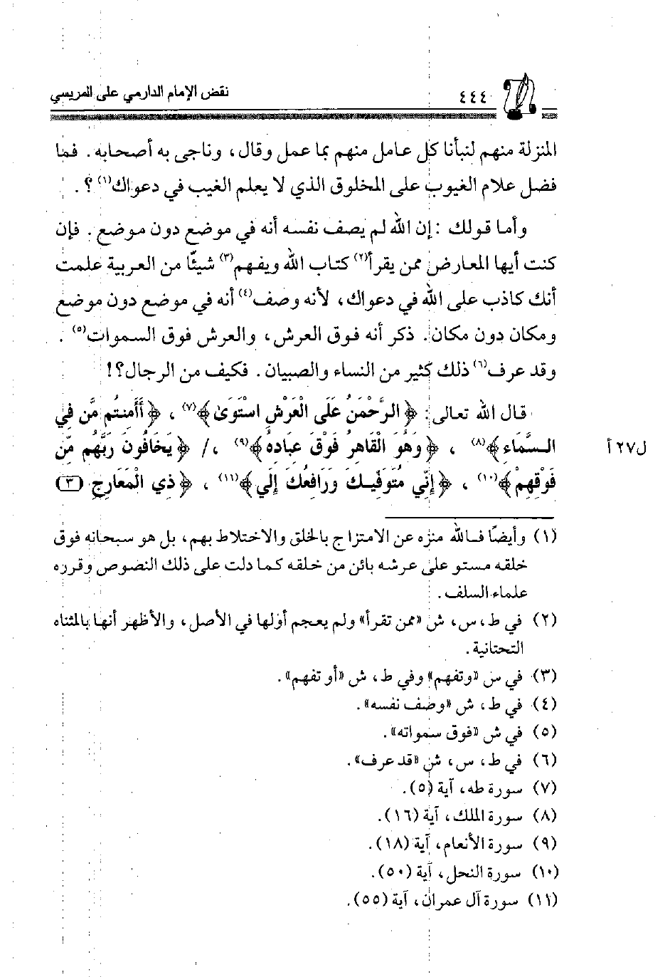 وَأَمَّا قَوْلُكَ: إِنَّ اللَّهَ لَمْ يَصِفْ نَفْسَهُ أَنَّهُ فِي مَوْضِعٍ دُونَ مَوْضِعٍ. فَإِنْ كُنْتَ أَيُّهَا الْمُعَارِضُ مِمَّنْ يَقْرَأُ2 كِتَابَ اللَّهِ وَيَفْهَمُ3 شَيْئًا مِنَ الْعَرَبِيَّةِ عَلِمْتَ أَنَّكَ كَاذِبٌ عَلَى اللَّهِ فِي دَعْوَاكَ؛ لِأَنَّهُ وَصَفَ4 أَنَّهُ فِي مَوْضِعٍ دُونَ مَوْضِعٍ وَمَكَانٍ دُونَ مَكَانٍ. ذَكَرَ أَنَّهُ فَوْقَ الْعَرْشِ، وَالْعَرْشُ فَوْقَ السَّمَوَاتِ54 وَقَدْ عَرَفَ6 ذَلِكَ كَثِيرٌ مِنَ النِّسَاءِ وَالصِّبْيَانِ, فَكَيْفَ مِنَ الرِّجَالِ؟!