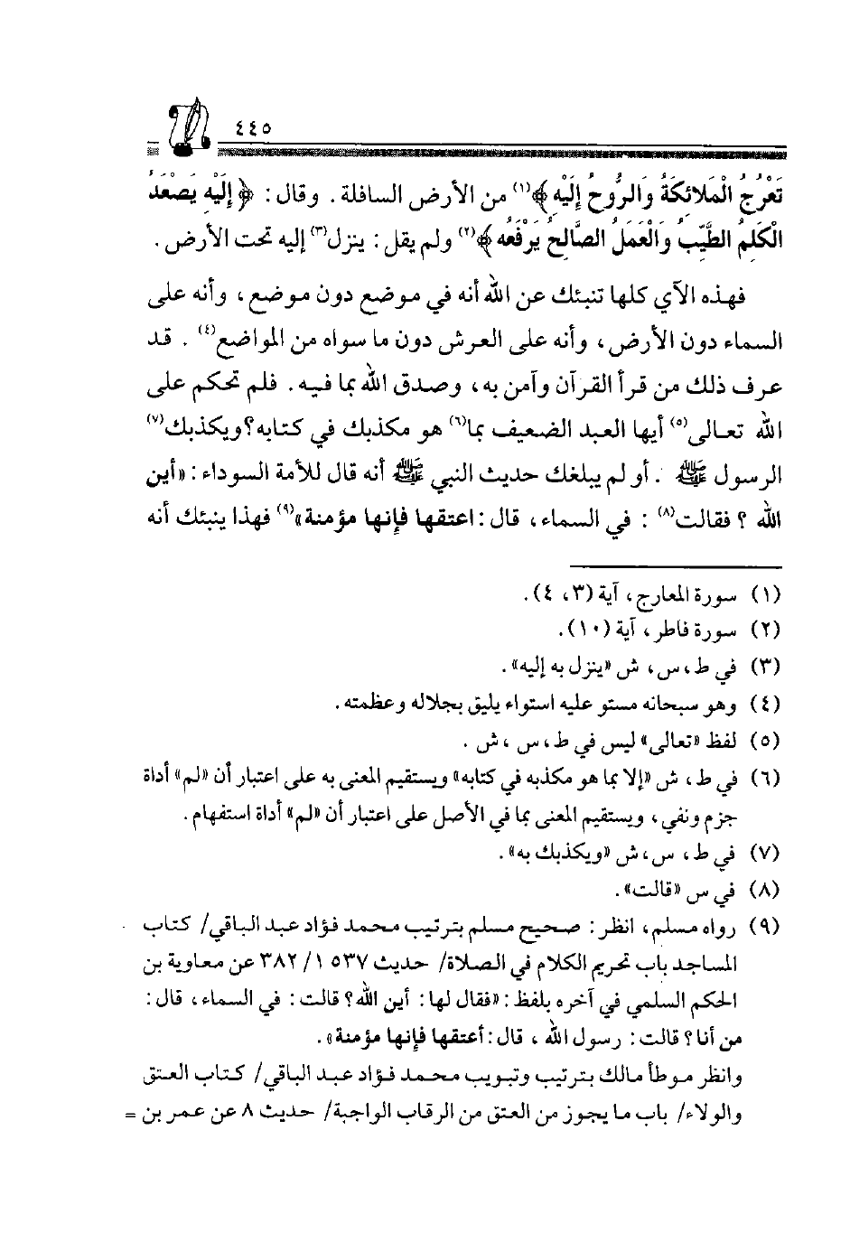 9 رَوَاهُ مُسلم، انْظُر: صَحِيح مُسلم بترتيب وتبويب مُحَمَّد فؤاد عبد الْبَاقِي، كتاب الْمَسَاجِد بَاب تَحْرِيم الْكَلَام فِي الصَّلَاة، حَدِيث 1537/ 382 عَنْ مُعَاوِيَةَ بْنِ الْحَكَمِ السُّلَمِيِّ فِي آخِره بِلَفْظ "فَقَالَ لَهَا: أَيْنَ اللَّهُ؟ قَالَتْ: فِي السَّمَاءِ، قَالَ من أَنا؟ قَالَت: رَسُول الله، قَالَ: اعتقها فَإِنَّهَا مُؤمنَة ".