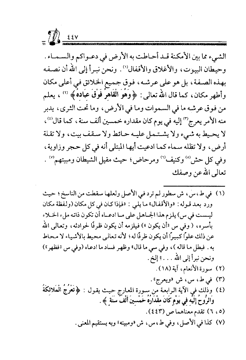 الشَّيْءُ مِمَّا بَيْنَ الْأَمْكِنَةِ قَدْ أَحَاطَتْ بِهِ الْأَرْضُ فِي دَعْوَاكُمْ وَالسَّمَاءُ وَحِيطَانُ الْبُيُوتِ، وَالْأَغْلَاقُ وَالْأَقْفَالُ1. وَنَحْنُ نَبْرَأُ إِلَى اللَّهِ أَنْ نَصِفَهُ بِهَذِهِ الصِّفَةِ، بَلْ هُوَ عَلَى عَرْشِهِ، فَوْقَ جَمِيعِ الْخَلَائِقِ فِي أَعْلَى مَكَانٍ وَأَطْهَرِ مَكَانٍ، كَمَا قَالَ الله تَعَالَى: {هُوَ الْقَاهِرُ فَوْقَ عِبَادِهِ} 2، يَعْلَمُ مِنْ فَوْقِ عَرْشِهِ مَا فِي السَّمَوَاتِ وَمَا فِي الأَرْضِ، وَمَا تَحْتَ الثَّرَى، يُدَبِّرُ مِنْهُ الْأَمر يعرج3 إِلَيْهِ فِي كل يَوْمٍ كَانَ مِقْدَارُهُ خَمْسِينَ أَلْفَ سَنَةٍ، كَمَا قَالَ4، لَا يُحِيطُ بِهِ شَيْءٌ وَلَا يَشْتَمِلُ عَلَيْهِ حَائِطٌ وَلَا سَقْفُ بَيْتٍ، وَلَا تُقِلُّهُ أَرْضٌ، وَلَا تُظِلُّهُ سَمَاءٌ كَمَا ادَّعَيْتَ أَيُّهَا الْمُبْتَلَى أَنَّهُ فِي كُلِّ حَجَرٍ وَزَاوِيَةٍ، وَفِي كُلِّ حُشٍّ5 وَكَنِيفٍ6 وَمِرْحَاضٍ، حَيْثُ مقيل الشَّيْطَان ومبيتهم7 تَعَالَى الله عَن وصفك