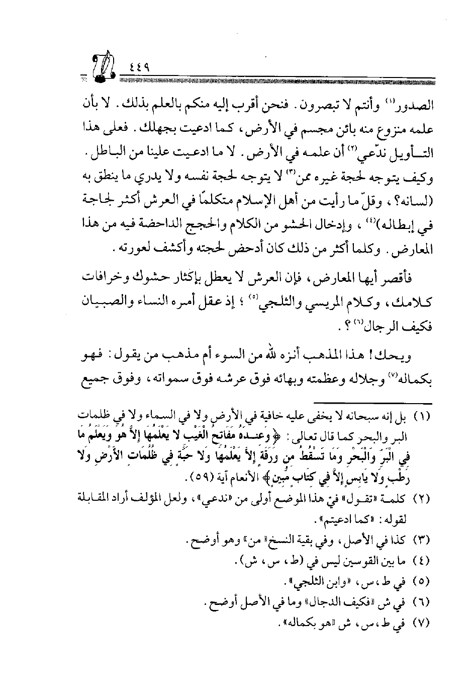 فَأَقْصِرْ أَيُّهَا الْمُعَارِضُ، فَإِنَّ الْعَرْشَ لَا يُعَطَّلُ بِإِكْثَارِ حَشْوِكَ وَخُرَافَاتِ كَلَامِكَ، وَكَلَامِ الْمَرِيسِيِّ وَالثَّلْجِيِّ5، إِذْ عَقِلَ أَمْرَهُ النِّسَاءُ وَالصِّبْيَانُ فَكَيْفَ الرِّجَالُ6؟.