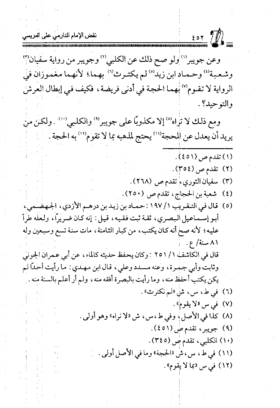 وَمَعَ ذَلِكَ لَا تَرَاهُ8 إِلَّا مَكْذُوبًا عَلَى جُوَيْبِرٍ9 وَالْكَلْبِيِّ10 وَلَكِنْ مَنْ يُرِيدُ أَنْ يَعْدِلَ عَنِ الْمَحَجَّةِ11 يَحْتَجُّ لِمَذْهَبِهِ بِمَا لَا تقوم12 بِهِ الْحجَّة.