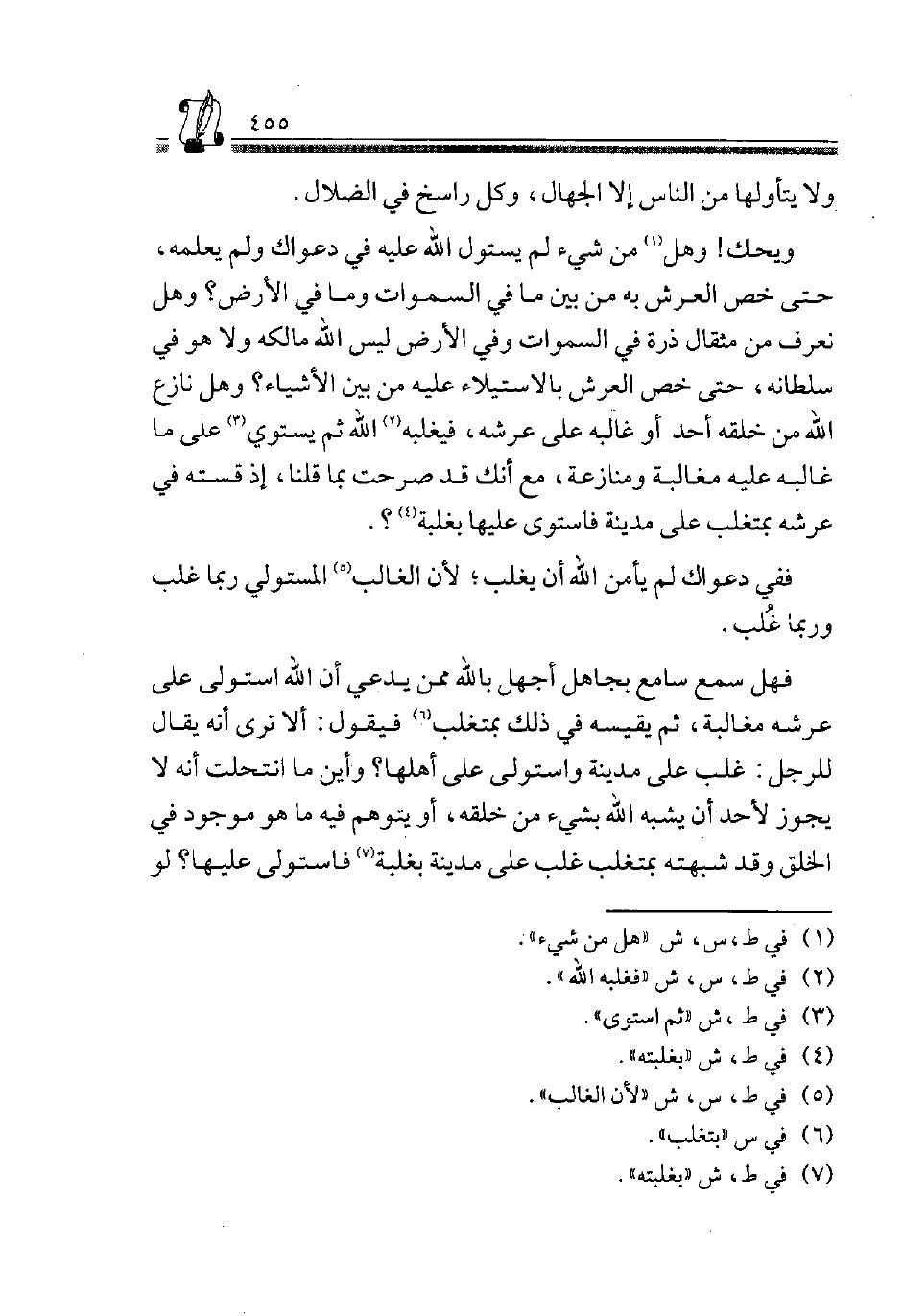 فَهَلْ سَمِعَ سَامِعٌ بِجَاهِلٍ أَجْهَلَ بِاللَّهِ مِمَّنْ يَدَّعِي أَنَّ اللَّهَ اسْتَوْلَى عَلَى عَرْشِهِ مُغَالَبَةً، ثُمَّ يَقِيسُهُ فِي ذَلِكَ بِمُتَغَلِّبٍ6 فَيَقُولُ: أَلَا تَرَى أَنَّهُ يُقَالُ لِلرَّجُلِ: غَلَبَ عَلَى مَدِينَةٍ وَاسْتَوْلَى عَلَى أَهْلِهَا؟ وَأَيْنَ مَا انْتَحَلْتَ أَنَّهُ لَا يَجُوزُ لِأَحَدٍ أَنْ يُشَبِّهَ اللَّهَ بِشَيْءٍ مِنْ خَلْقِهِ، أَوْ يَتَوَهَّمَ فِيهِ مَا هُوَ مَوْجُودٌ فِي الْخلق وَقد شبهته بمتغلب غلب عَلَى مَدِينَةٍ بِغَلَبَةٍ7 فَاسْتَوْلَى عَلَيْهَا؟ لَو