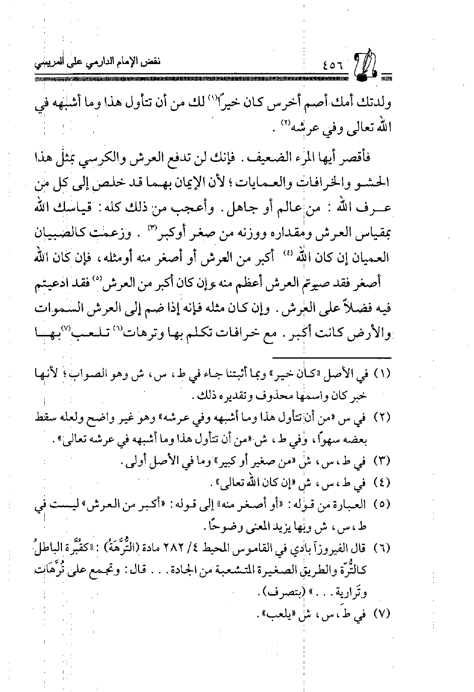 فَأَقْصِرْ أَيُّهَا الْمَرْءُ الضَّعِيفُ. فَإِنَّكَ لَنْ تَدْفَعَ الْعَرْشَ وَالْكُرْسِيَّ بِمِثْلِ هَذَا الْحَشْوِ وَالْخُرَافَاتِ وَالْعَمَايَاتِ؛ لِأَنَّ الْإِيمَانَ بِهِمَا قَدْ خَلُصَ إِلَى كُلِّ مَنْ عَرَفَ اللَّهَ: مِنْ عَالِمٍ أَوْ جَاهِلٍ. وَأَعْجَبُ مِنْ ذَلِكَ كُلِّهِ: قِيَاسُكَ اللَّهَ بِمِقْيَاسِ الْعَرْشِ وَمِقْدَارِهِ وَزنه من أَصْغَر أَوْ كِبَرٍ3 وَزَعَمْتَ كَالصِّبْيَانِ الْعِمْيَانِ إِنْ كَانَ اللَّهُ4 أَكْبَرَ مِنَ الْعَرْشِ أَوْ أَصْغَرَ مِنْهُ أَوْ مِثْلَهُ فَإِنْ كَانَ اللَّهُ أَصْغَرَ فَقَدْ صَيَّرْتُمُ الْعَرْشَ أَعْظَمَ مِنْهُ وَإِنْ كَانَ أَكْبَرَ مِنَ الْعَرْشِ5 فَقَدِ ادَّعَيْتُمْ فِيهِ فَضْلًا عَلَى الْعَرْشِ. وَإِنْ كَانَ مِثْلَهُ فَإِنَّهُ إِذَا ضَمَّ إِلَى الْعَرْشِ السَّمَوَاتِ وَالْأَرْضَ كَانَتْ أَكْبَرَ مَعَ خُرَافَاتٍ تكلم بهَا وترهات6 تعلب7 بهَا