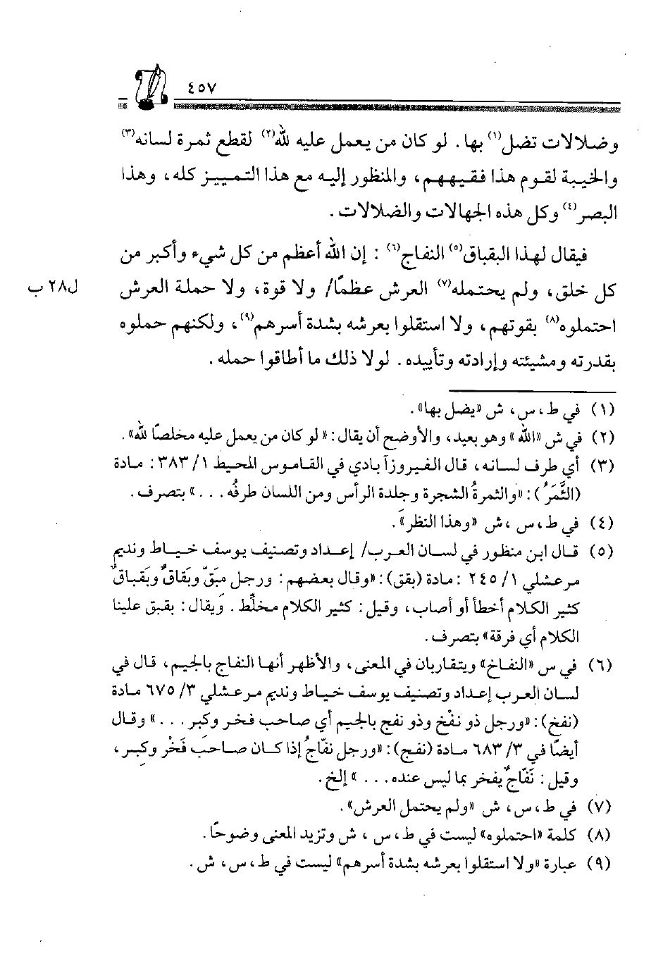 6 فِي س "النفاخ" ويتقاربان فِي الْمَعْنى، وَالْأَظْهَر أَنَّهَا النفاج بِالْجِيم، قَالَ فِي لِسَان الْعَرَب إعداد وتصنيف يُوسُف خياط ونديم مرعشلي 3/ 675 مَادَّة "نفخ": "وَرجل ذُو نفخ وَذُو نفج بِالْجِيم أَي صَاحب فَخر وَكبر...." وَقَالَ أَيْضا فِي 3/ 683 مَادَّة "نفج": "وَرجل نفاج إِذا كَانَ صَاحب فَخر وَكبر وَقيل: نفاج يفخر بِمَا لَيْسَ عِنْده" إِلَخ.