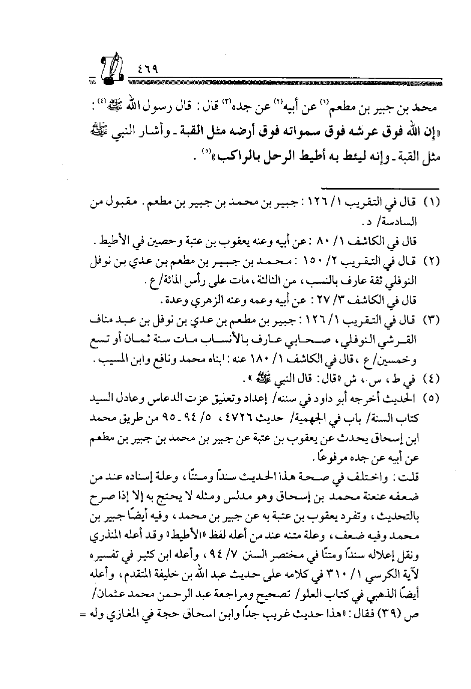 مُحَمَّدِ بْنِ جُبَيْرِ بْنِ مُطْعَمٍ1، عَنْ أَبِيهِ2، عَنْ جَدِّهِ3 قَالَ: قَالَ رَسُولُ اللَّهِ صَلَّى اللَّهُ عَلَيْهِ وَسَلَّمَ4: "إِنَّ اللَّهَ فَوْقَ عَرْشِهِ فَوْقَ سَمَوَاتِهِ فَوْقَ أَرْضِهِ مِثْلُ الْقُبَّةِ -وَأَشَارَ النَّبِيُّ صَلَّى اللَّهُ عَلَيْهِ وَسَلَّمَ مِثْلَ الْقُبَّةِ- وَإِنَّهُ لَيَئِطُّ بِهِ أَطِيطَ الرَّحْلِ بالراكب" 5.