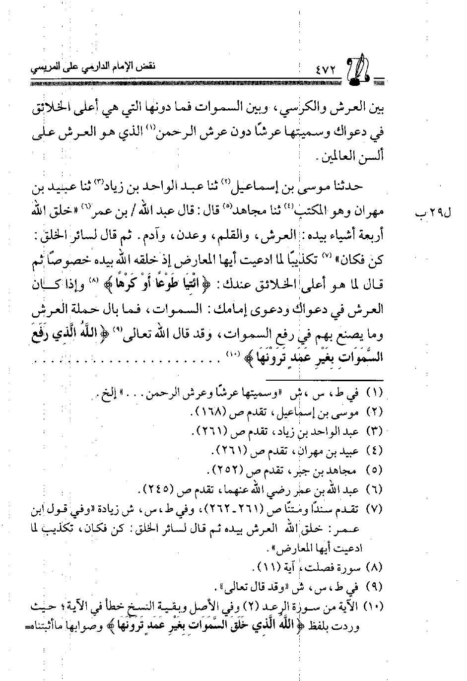 حَدَّثَنَا مُوسَى بْنُ إِسْمَاعِيلَ2، ثَنَا عَبْدُ الْوَاحِدِ بْنُ زِيَادٍ3، ثَنَا عُبَيْدُ بْنُ مِهْرَانَ وَهُوَ الْمُكْتِبُ4، ثَنَا مُجَاهِدٌ5 قَالَ: قَالَ عَبْدُ الله، بن عمر6 "خلق أَرْبَعَةَ أَشْيَاءَ بِيَدِهِ: الْعَرْشُ، وَالْقَلَمُ، وَعَدْنٌ، وَآدَمُ. ثُمَّ قَالَ لِسَائِرِ الْخَلْقِ كُنْ فَكَانَ"7 تَكْذِيبًا لِمَا ادَّعَيْتَ أَيُّهَا الْمُعَارِضُ إِذْ خَلَقَهُ اللَّهُ بِيَدِهِ خُصُوصًا ثُمَّ قَالَ لِمَا هُوَ أَعْلَى الْخَلَائِقِ عِنْدَكَ: {اِئْتِيَا طَوْعاً أَوْ كَرْهاً} 8 وَإِذَا كَانَ الْعَرْشُ فِي دَعْوَاكَ إِمَامِكَ: السَّمَوَاتِ، فَمَا بَالُ حَمَلَةِ الْعَرْشِ وَمَا يُصْنَعُ بِهِمْ فِي رَفْعِ السَّمَوَاتِ، وَقَدْ قَالَ اللَّهُ تَعَالَى9 {اللَّهُ الَّذِي رَفَعَ السَّمَوَاتِ بِغَيْرِ عَمَدٍ تَرَوْنَهَا} 10..............................
