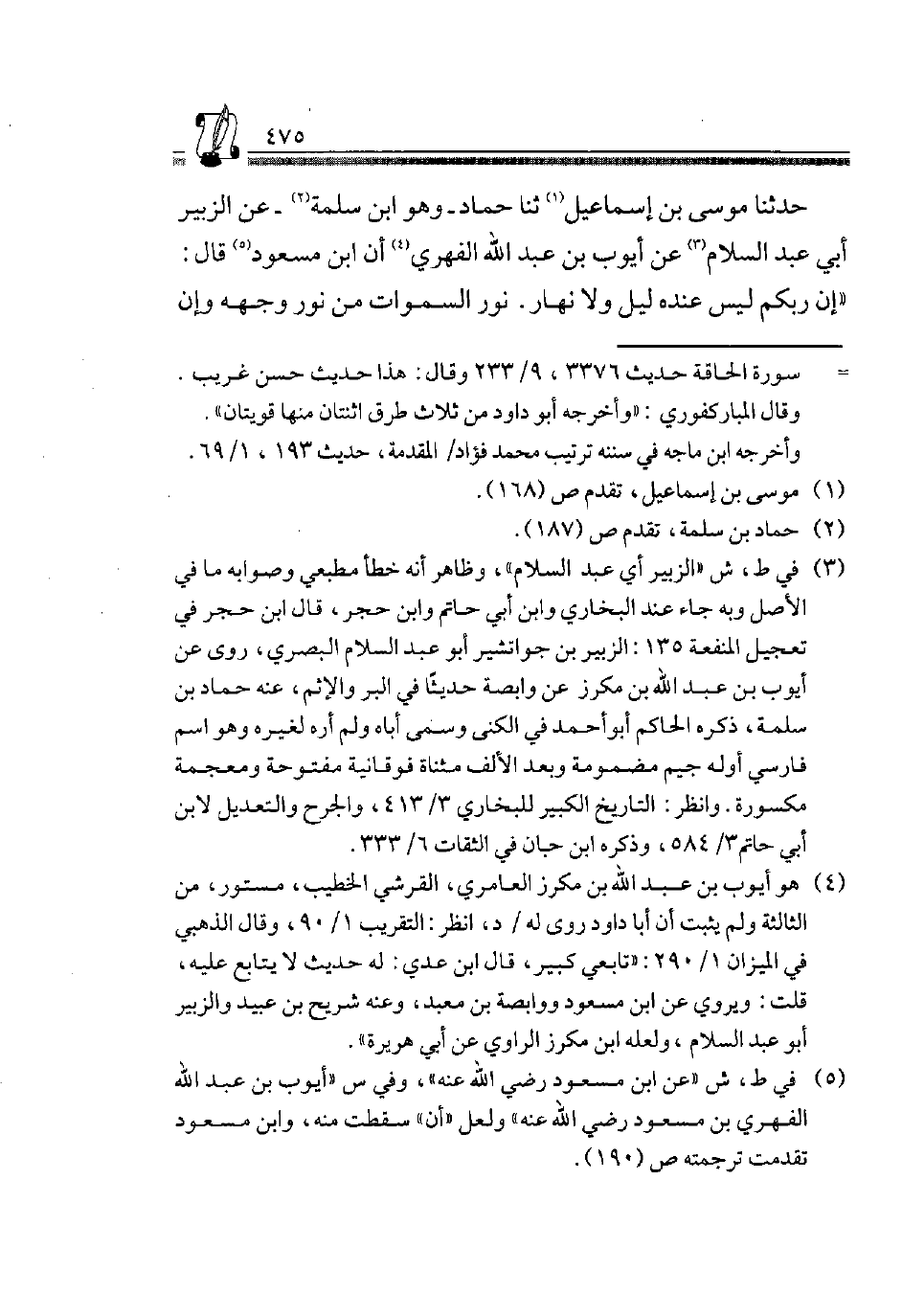 حَدَّثَنَا مُوسَى بْنُ إِسْمَاعِيلَ1، ثَنَا حَمَّادُ -وَهُوَ ابْنُ سَلَمَةَ2- عَنْ أَبِي عَبْدِ السَّلَامِ3، عَنْ أَيُّوبَ بْنِ عَبْدِ اللَّهِ الْفِهْرِيِّ4 أَنَّ ابْنَ مَسْعُودٍ5 قَالَ: "إِنَّ رَبَّكُمْ لَيْسَ عِنْدَهُ لَيْلٌ وَلَا نَهَارٌ. نُورُ السَّمَوَاتِ مِنْ نُورِ وَجْهِهِ وَإِن