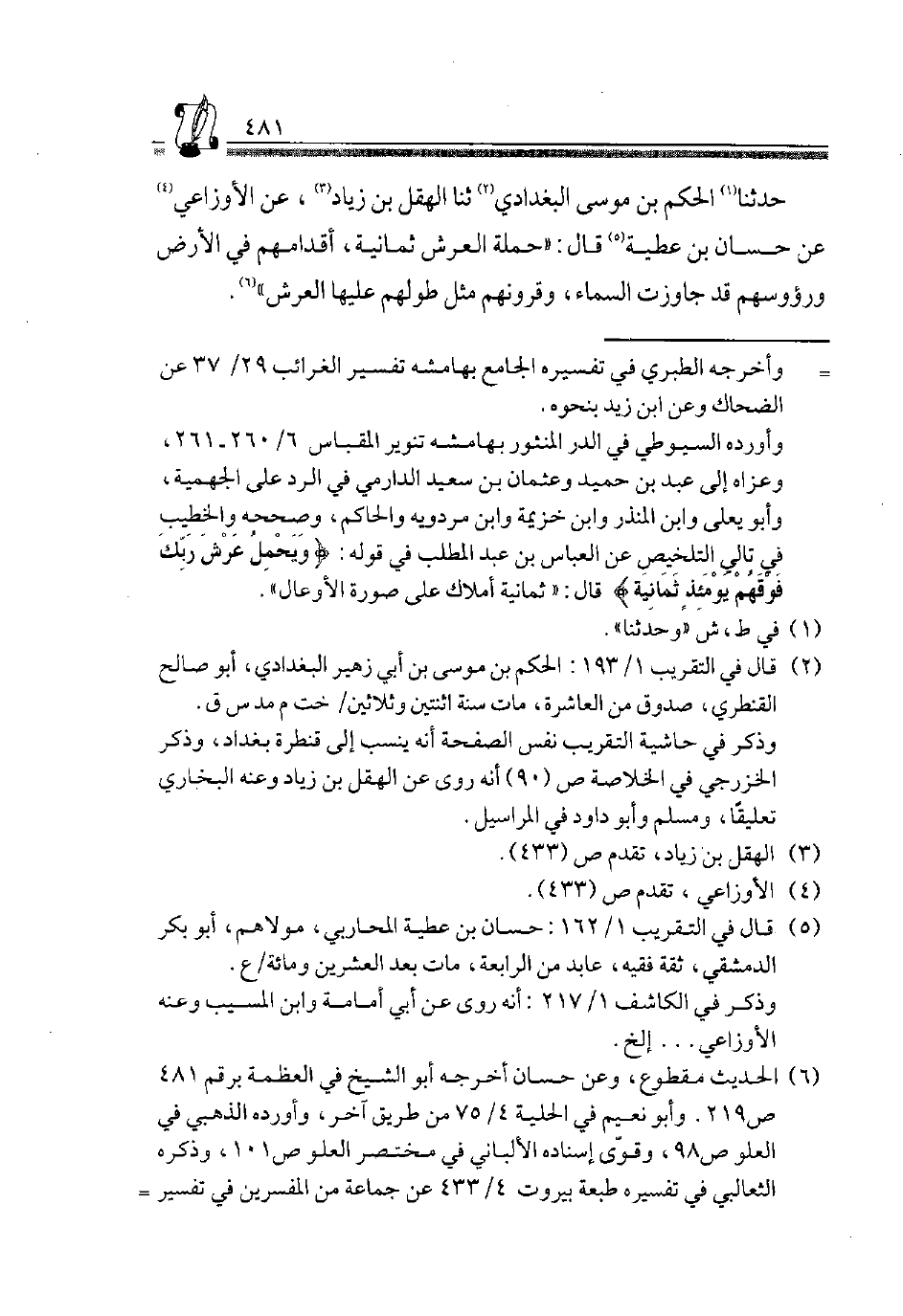 وَأوردهُ السُّيُوطِيّ فِي الدّرّ المنثور بهامشه تنوير المقباس 6/ 260-261 وَعَزاهُ إِلَى عبد بن حميد وَعُثْمَان بن سعيد الدَّارمِيّ فِي الرَّد على الْجَهْمِية، وَأَبُو يعلى وَابْن الْمُنْذر وَابْن خُزَيْمَة وَابْن مردوية وَالْحَاكِم، وَصَححهُ والخطيب فِي تالي التَّلْخِيص عَنِ الْعَبَّاسِ بْنِ عَبْدِ الْمُطَّلِبِ فِي قَوْله: {وَيَحْمِلُ عَرْشَ رَبِّكَ فَوْقَهُمْ يَوْمَئِذٍ ثَمَانِيَةٌ} قَالَ: "ثَمَانِيَةُ أَمْلَاكٍ عَلَى صُورَةِ الأوعال".
