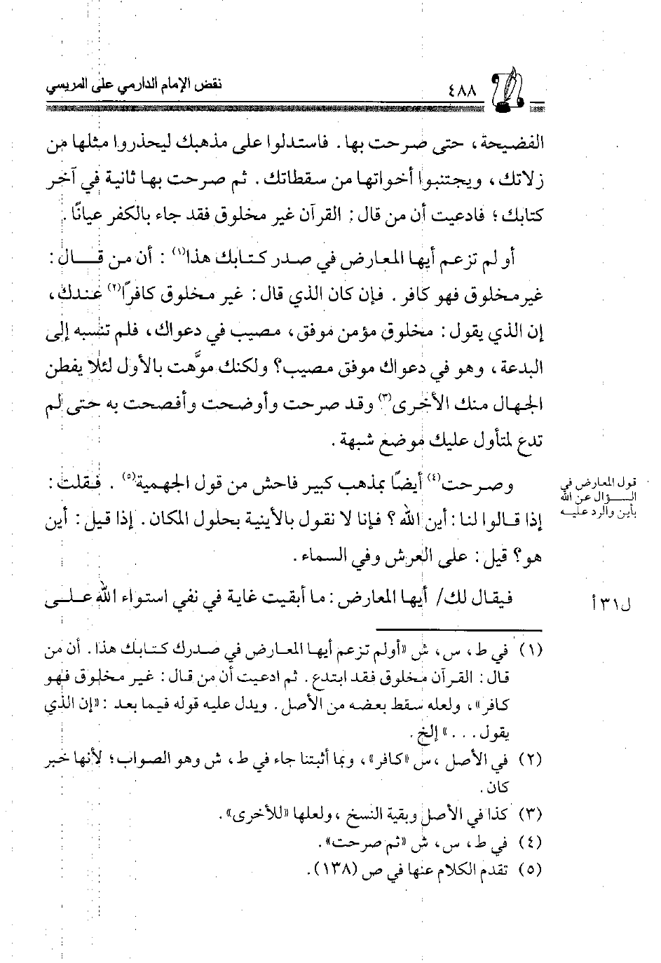 1 فِي ط، س، ش "أَوَلَمْ تَزْعُمْ أَيُّهَا الْمُعَارِضُ فِي صدرك كِتَابِكَ هَذَا، أَنَّ مَنْ قَالَ: الْقُرْآن مَخْلُوق فقد ابتدع، ثمَّ ادعيت أَنَّ مَنْ قَالَ: غَيْرُ مَخْلُوقٍ فَهُوَ كَافِر" وَلَعَلَّه سقط بعضه من الأَصْل، وَيدل عَلَيْهِ قَوْله، فِيمَا بعد: "إِن الَّذِي يَقُول.." إِلَخ.