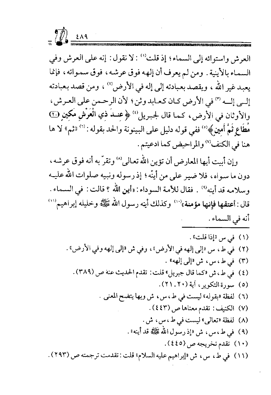 الْعَرْشِ وَاسْتِوَائِهِ إِلَى السَّمَاءِ، إِذْ قُلْتَ1: لَا نَقُولُ: إِنَّهُ عَلَى الْعَرْشِ وَفِي السَّمَاءِ بِالْأَيْنِيَّةِ، وَمَنْ لَمْ يَعْرِفْ أَنَّ إِلَهَهُ فَوْقَ عَرْشِهِ، فَوْقَ سَمَوَاتِهِ، فَإِنَّمَا يَعْبُدُ غَيْرَ اللَّهِ، وَيَقْصِدُ بِعِبَادَتِهِ إِلَى إِلَهٍ فِي الْأَرْضِ2 وَمَنْ قَصَدَ بِعِبَادَتِهِ إِلَى إِلَهٍ3 فِي الْأَرْضِ كَانَ كَعَابِدِ وَثَنٍ؛ لِأَنَّ الرَّحْمَنَ عَلَى الْعَرْشِ وَالْأَوْثَانُ فِي الْأَرْضِ، كَمَا قَالَ لِجِبْرِيلَ4 {عِنْدَ ذِي الْعَرْشِ مَكِينٍ، مُطَاعٍ ثَمَّ أَمِينٍ} 5 فَفِي قَوْلِهِ دَلِيلٌ عَلَى الْبَيْنُونَةِ وَالْحَدِّ بِقَوْلِهِ:6 "ثَمَّ" لَا هَاهُنَا فِي الْكَنفِ7 وَالْمَرَاحِيضِ كَمَا ادَّعَيْتُمْ.