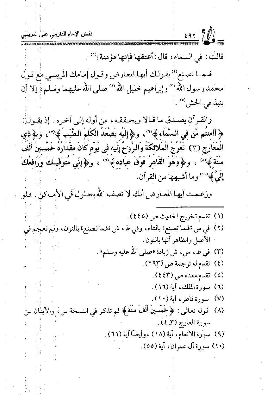 فَمَا نَصْنَعُ2 بِقَوْلِكَ أَيُّهَا الْمُعَارِضُ وَقَوْلِ إِمَامِكَ الْمَرِيسِيِّ مَعَ قَوْلِ مُحَمَّدٍ رَسُولِ اللَّهِ 2وَإِبْرَاهِيمَ خَلِيلِ اللَّهِ4 صَلَّى اللَّهُ عَلَيْهِمَا وَسَلَّمَ، إِلَّا أَنْ يُنْبَذَ فِي الْحُشِّ.