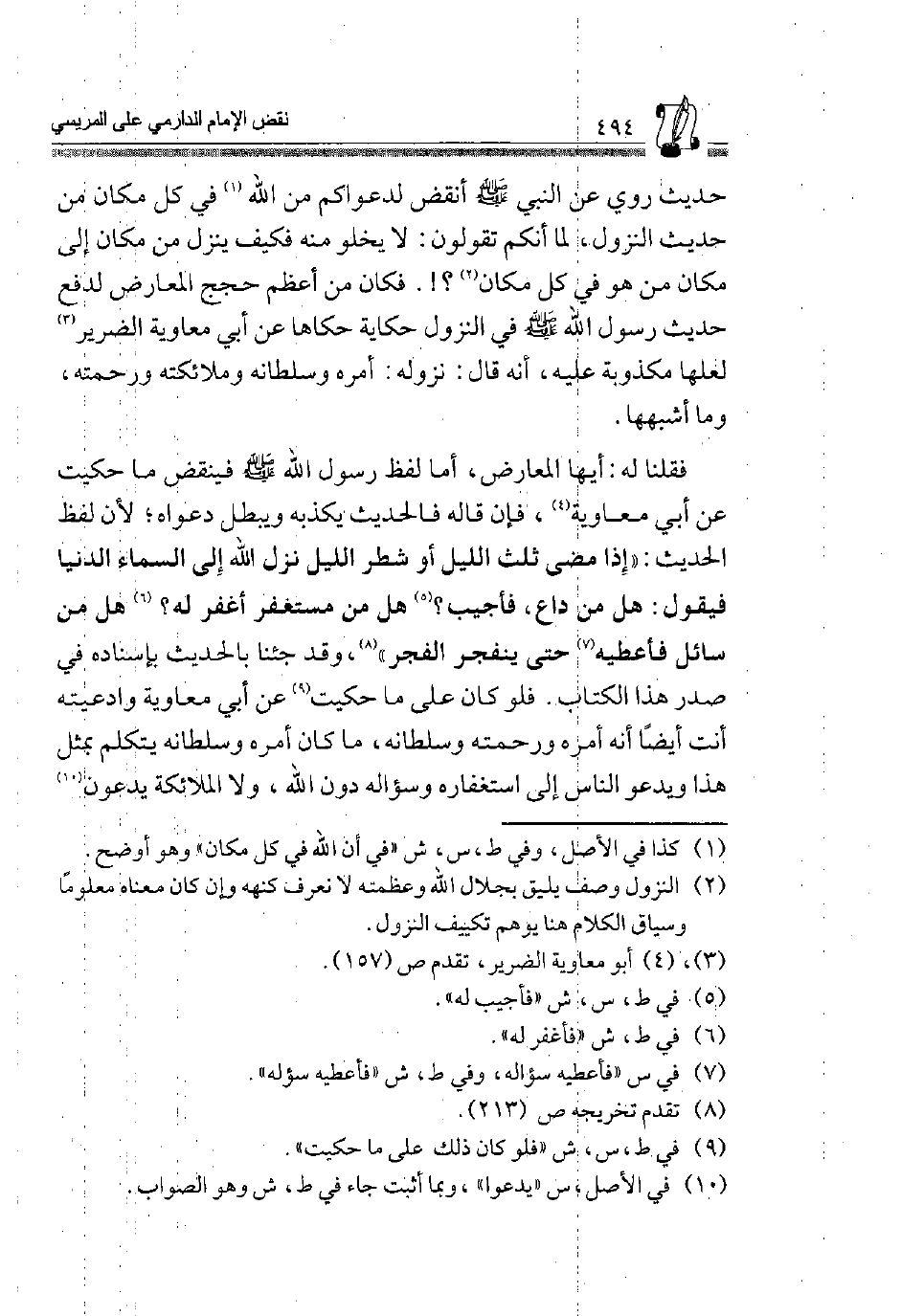 حَدِيثٌ رُوِيَ عَنِ النَّبِيِّ صَلَّى الله عَلَيْهِ وَسلم لدعواكم من اللَّهَ1 فِي كُلِّ مَكَانٍ مِنْ حَدِيثِ النُّزُولِ، لَمَّا أَنَّكُمْ تَقُولُونَ: لَا يَخْلُو مِنْهُ فَكَيْفَ يَنْزِلُ مِنْ مَكَانٍ إِلَى مَكَانٍ مَنْ هُوَ فِي كُلِّ مَكَانٍ2؟! فَكَانَ مِنْ أَعْظَمِ حُجَجِ الْمُعَارِضِ لِدَفْعِ حَدِيثِ رَسُولِ اللَّهِ صَلَّى اللَّهُ عَلَيْهِ وَسَلَّمَ فِي النُّزُولِ حِكَايَةٌ حَكَاهَا عَنْ أَبِي مُعَاوِيَةَ الضَّرِيرِ3 لَعَلَّهَا مَكْذُوبَةٌ عَلَيْهِ، أَنَّهُ قَالَ: نُزُولُهُ: أَمْرُهُ وَسُلْطَانُهُ وَمَلَائِكَتُهُ وَرَحْمَتُهُ، وَمَا أَشْبَهَهَا.