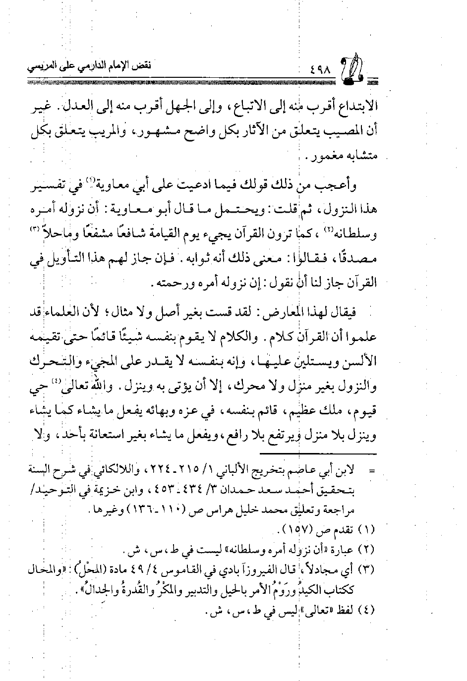 وَأَعْجَبُ مِنْ ذَلِكَ قَوْلُكَ فِيمَا ادَّعَيْتَ عَلَى أَبِي مُعَاوِيَةَ1 فِي تَفْسِيرِ هَذَا النُّزُولِ، ثُمَّ قُلْتَ: وَيُحْتَمَلُ مَا قَالَ أَبُو مُعَاوِيَةَ: إِنَّ نُزُولَهُ أَمْرُهُ وَسُلْطَانُهُ2 كَمَا تَرَوْنَ الْقُرْآنَ يَجِيءُ يَوْمَ الْقِيَامَةِ شَافِعًا مُشَفَّعًا وَمَاحِلًا3 مُصَدِّقًا، فَقَالُوا: مَعْنَى ذَلِكَ أَنَّهُ ثَوَابُهُ فَإِنْ جَازَ لَهُمْ هَذَا التَّأْوِيلُ فِي الْقُرْآنِ جَازَ لَنَا أَنْ نَقُولَ: إِنَّ نُزُولَهُ أَمْرُهُ وَرَحْمَتُهُ.