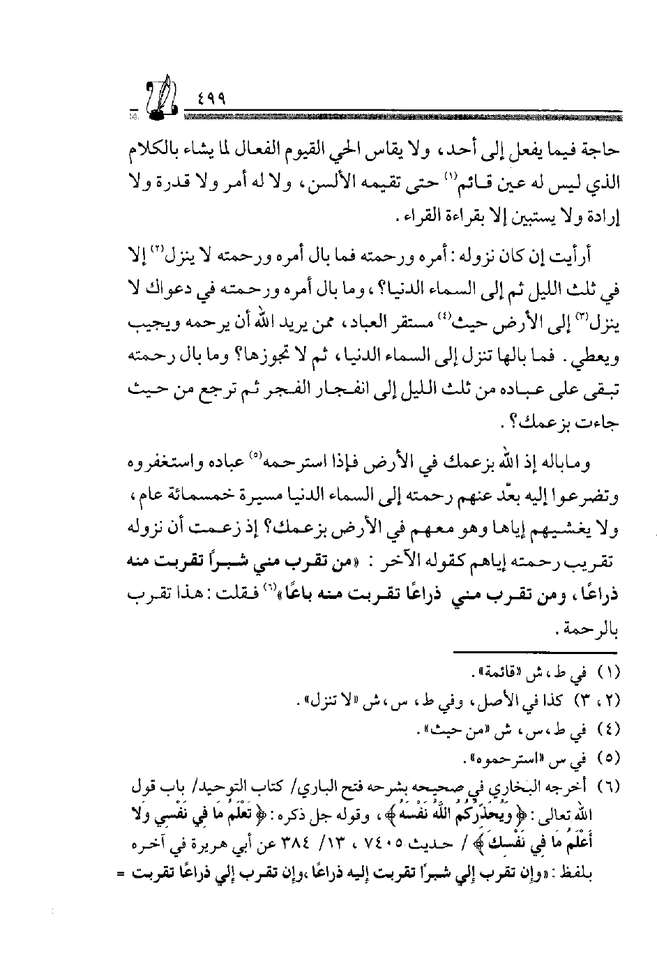 6 أخرجه البُخَارِيّ فِي صَحِيحه بشرحه فتح الْبَارِي، كتاب التَّوْحِيد، بَاب قَول الله تَعَالَى: {وَيُحَذِّرُكُمُ اللَّهُ نَفْسَهُ} وَقَوله جلّ ذكره {تَعْلَمُ مَا فِي نَفْسِي وَلا أَعْلَمُ مَا فِي نَفْسِكَ} ، حَدِيث 7405، 13/ 384 عَن