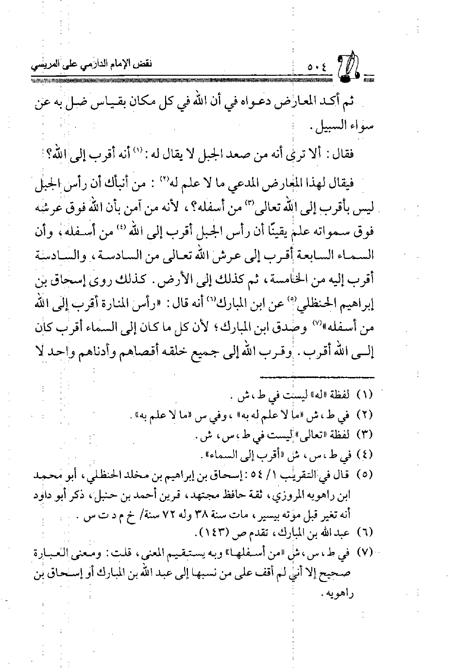 فَيُقَالُ لِهَذَا الْمُعَارِضِ الْمُدَّعِي مَا لَا عِلْمَ لَهُ2: مَنْ أَنْبَأَكَ أَنَّ رَأْسَ الْجَبَلِ لَيْسَ بِأَقْرَبَ إِلَى اللَّهِ تَعَالَى3 مِنْ أَسْفَلِهِ؟؛ لِأَنَّهُ مَنْ آمَنَ بِأَنَّ اللَّهَ فَوْقَ عَرْشِهِ فَوْقَ سَمَوَاتِهِ عَلِمَ يَقِينًا أَنَّ رَأْسَ الْجَبَلِ أَقْرَبُ إِلَى اللَّهِ4 مِنْ أَسْفَلِهِ، وَأَنَّ السَّمَاءَ السَّابِعَةَ أَقْرَبُ إِلَى عَرْشِ اللَّهِ تَعَالَى مِنَ السَّادِسَةِ، وَالسَّادِسَةَ أَقْرَبُ إِلَيْهِ مِنَ الْخَامِسَةِ، ثُمَّ كَذَلِكَ إِلَى الْأَرْضِ. كَذَلِكَ رَوَى إِسْحَاقُ بْنُ إِبْرَاهِيمَ الْحَنْظَلِيُّ5، عَنِ ابْنِ الْمُبَارَكِ6 أَنَّهُ قَالَ: "رَأْسُ الْمَنَارَةِ أَقْرَبُ إِلَى اللَّهِ مِنْ أَسْفَلِهِ7 وَصَدَقَ ابْنُ الْمُبَارَكِ؛ لِأَنَّ كُلَّ مَا كَانَ إِلَى السَّمَاءِ أَقْرَبُ كَانَ إِلَى اللَّهِ أَقْرَبَ. وَقُرْبُ اللَّهِ إِلَى جَمِيعِ خَلْقِهِ أَقْصَاهُم وأدناهم وَاحِد لَا