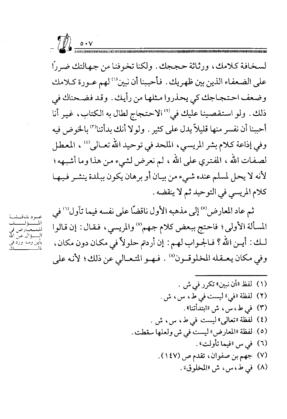 لِسَخَافَةِ كَلَامِكَ، وَرَثَاثَةِ حُجَجِكَ. وَلَكِنَّا تَخَوَّفْنَا مِنْ جَهَالَتِكَ ضَرَرًا عَلَى الضُّعَفَاءِ الَّذِينَ بَيْنَ ظَهْرَيْكَ، فَأَحْبَبْنَا أَنْ نُبَيِّنَ1 لَهُمْ عَوْرَةَ كَلَامِكَ وَضَعْفَ احْتِجَاجِكَ كَيْ يَحْذَرُوا مِثْلَهَا مِنْ رَأْيِكَ، وَقَدْ فَضَحْنَاكَ فِي ذَلِكَ وَلَوِ اسْتَقْصَيْنَا عَلَيْكَ فِي2 الِاحْتِجَاج لطال لَهُ الْكِتَابُ، غَيْرَ أَنَّا أَحْبَبْنَا أَنْ نُفَسِّرَ مِنْهَا قَلِيلًا يَدُلُّ عَلَى كثير. وَلَو أَنَّكَ بَدَأْتَنَا3 بِالْخَوْضِ فِيهِ وَفِي إِذَاعَةِ كَلَامِ بِشْرٍ الْمَرِيسِيِّ، الْمُلْحِدِ فِي تَوْحِيدِ اللَّهِ تَعَالَى4، الْمُعَطِّلِ؛ لِأَنَّهُ لَا يَحِلُّ لِمُسْلِمٍ عِنْدَهُ شَيْءٌ مِنْ بَيَانٍ أَوْ بُرْهَانٍ يكون ببلدة ينتشر فِيهَا كَلَامُ الْمَرِيسِيِّ فِي التَّوْحِيدِ ثمَّ لَا ينْقضه.