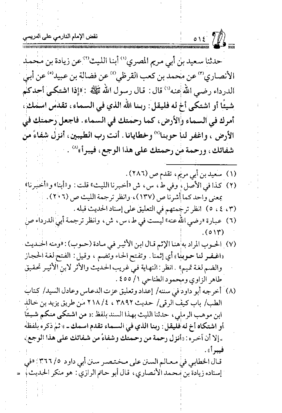 حَدَّثَنَا سَعِيدُ بْنُ أَبِي مَرْيَمَ الْمصْرِيّ1، أبنا اللَّيْثُ2، عَنْ زِيَادَةَ بْنِ مُحَمَّدٍ الْأَنْصَارِيِّ3، عَنْ مُحَمَّدِ بْنِ كَعْبٍ الْقُرَظِيِّ4، عَنْ فَضَالَةَ بْنِ عُبَيْدٍ5، عَنْ أَبِي الدَّرْدَاءِ رَضِيَ اللَّهُ عَنْهُ6 قَالَ: قَالَ رَسُولُ اللَّهِ صَلَّى اللَّهُ عَلَيْهِ وَسَلَّمَ: "إِذَا اشْتَكَى أَحَدُكُمْ شَيْئًا أَوِ اشْتَكَى أَخٌ لَهُ فَلْيَقُلْ: رَبُّنَا اللَّهُ الَّذِي فِي السَّمَاءِ، تَقَدَّسَ اسْمُكَ أَمْرُكَ فِي السَّمَاءِ وَالْأَرْضِ، كَمَا رَحْمَتُكَ فِي السَّمَاءِ. فَاجْعَلْ رَحْمَتَكَ فِي الْأَرْضِ، وَاغْفِرْ لَنَا حُوبَنَا 7 وَخَطَايَانَا أَنْتَ رَبُّ الطَّيِّبِينَ، أَنْزِلْ شِفَاءً مِنْ شِفَائِكَ، وَرَحْمَةً مِنْ رَحْمَتِكَ عَلَى هَذَا الْوَجَعِ، فَيَبْرَأَ" 8.