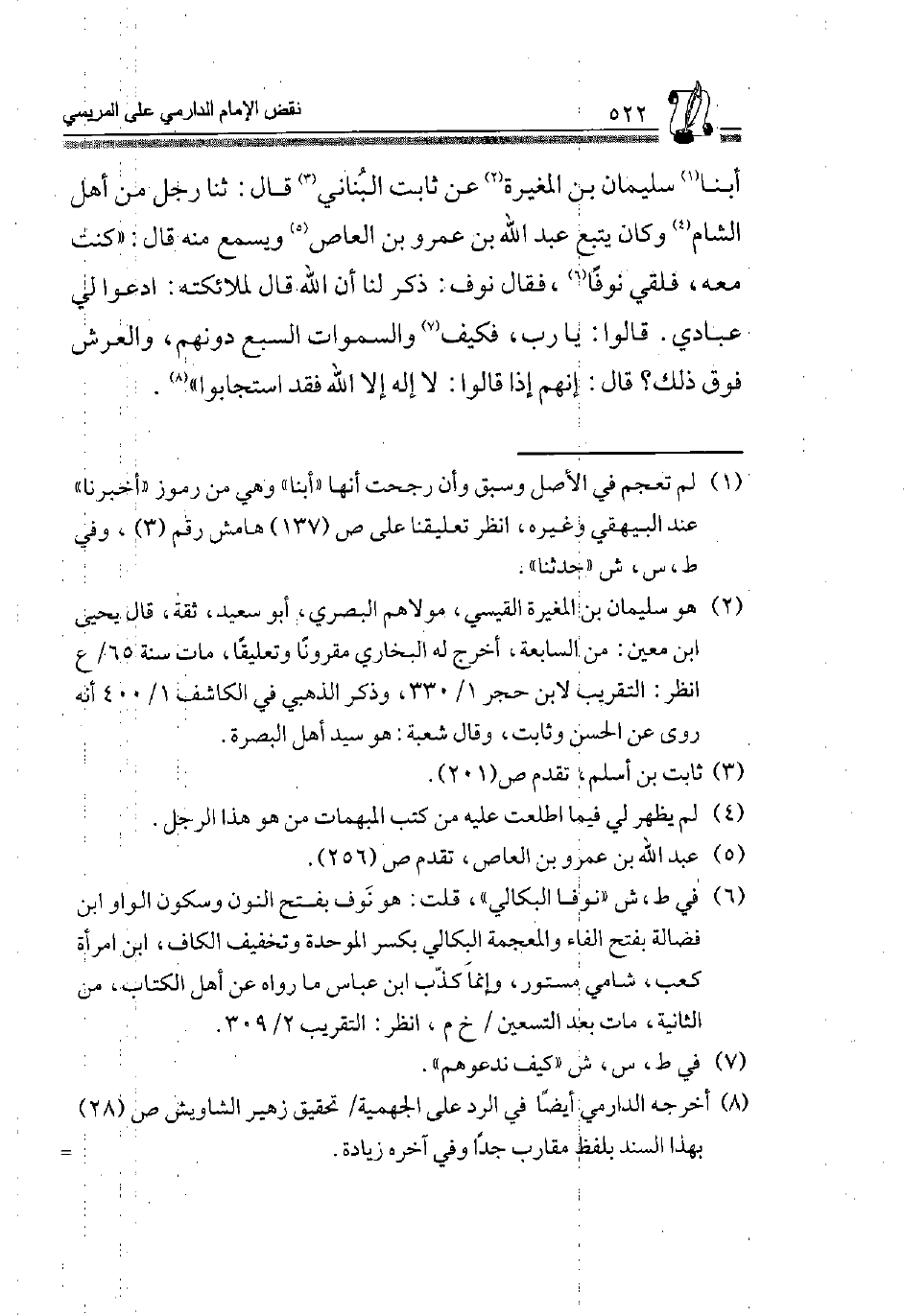 8 أخرجه الدَّارمِيّ أَيْضا فِي الرَّد على الْجَهْمِية، تَحْقِيق زُهَيْر الشاويش ص"28" بِهَذَا السَّنَد بِلَفْظ مقارب جدًّا وَفِي آخِره زِيَادَة. وَذكره ابْن الْقيم فِي اجمتاع الجيوش الإسلامية، طبعة السلفية، ص"102" عَن نوف الْبكالِي مُخْتَصرا وَعَزاهُ إِلَى الدَّارمِيّ.