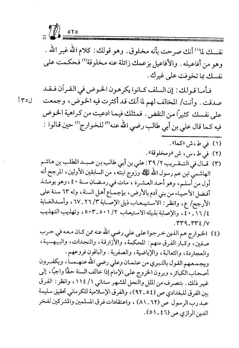 فَأَمَّا قَوْلُكَ: إِنَّ السَّلَفَ كَانُوا يَكْرَهُونَ الْخَوْضَ فِي الْقُرْآنِ فَقَدْ صَدَقْتَ. وَأَنْتَ، الْمُخَالِفُ لَهُمْ لَمَّا أَنَّكَ قَدْ أَكْثَرْتَ فِيهِ الْخَوْضَ، وَجَمَعْتَ عَلَى نَفْسِكَ كثير مِنَ النَّقْضِ. فَمِثْلُكَ فِيمَا ادَّعَيْتَ مِنْ كَرَاهِيَةِ الْخَوْضِ فِيهِ كَمَا قَالَ عَلِيُّ بْنُ أَبِي طَالِبٍ رَضِيَ اللَّهُ عَنْهُ3 لِلْخَوَارِجِ4 حِينَ قَالُوا: