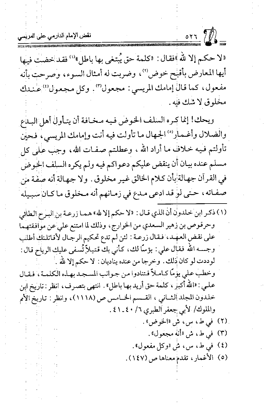 "لَا حُكْمَ إِلَّا لِلَّهِ" فَقَالَ: "كَلِمَةُ حَقٍّ يُبْتَغَى بِهَا بَاطِلٌ"1 فَقَدْ خُضْتَ فِيهَا أَيُّهَا الْمُعَارِضُ بِأَقْبَحِ خَوْضٍ2 وَضَرَبْتَ لَهُ أَمْثَالَ السُّوءِ، وَصَرَّحْتَ بِأَنَّهُ مَفْعُولٌ، كَمَا قَالَ إِمَامُكَ الْمَرِيسِيُّ: مَجْعُولٌ3 وَكُلُّ مَجْعُولٍ4 عِنْدَكَ مَخْلُوقٌ لَا شَكَّ فِيهِ.