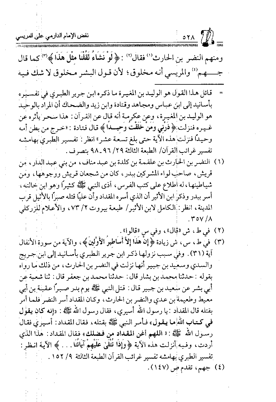 وَمِنْهُمُ النَّضْرُ بْنُ الْحَارِثِ1 فَقَالَ2: {لَوْ نَشَاءُ لَقُلْنَا مِثْلَ هَذَا} 3 كَمَا قَالَ جَهْمٌ4 وَالْمَرِيسِيُّ أَنَّهُ مَخْلُوقٌ؛ لِأَنَّ قَوْلَ الْبَشَرِ مَخْلُوقٌ لَا شكّ فِيهِ