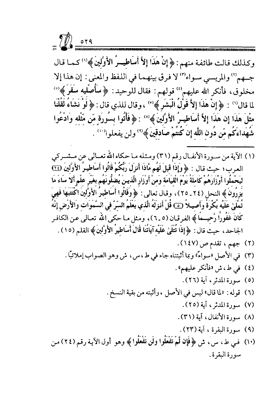 وَكَذَلِكَ قَالَتْ طَائِفَةٌ مِنْهُمْ: {إِنْ هَذَا إِلاَّ أَسَاطِيرُ الأَوَّلِينَ} 1 كَمَا قَالَ جَهْمٌ2 وَالْمَرِيسِيُّ سَوَاءً3 لَا فَرْقَ بَيْنَهُمَا فِي اللَّفْظِ وَالْمَعْنَى: إِنْ هَذَا إِلَّا مَخْلُوقٌ، فَأنْكر عَلَيْهِمْ4 قَوْلَهُمْ: فَقَالَ لِلْوَحِيدِ: {سَأُصْلِيهِ سَقَرَ} 5 لَمَّا قَالَ6: {إِنْ هَذَا إِلَّا قَوْلُ الْبَشَرِ} 7 وَقَالَ لِلَّذِي قَالَ: {لَوْ نَشَاءُ لَقُلْنَا مِثْلَ هَذَا إِنْ هَذَا إِلاَّ أَسَاطِيرُ الأَوَّلِينَ} 8: {فَأْتُوا بِسُورَةٍ مِّنْ مِثْلِهِ وَادْعُوا شُهَدَاءَكُمْ مِنْ دُونِ اللَّهِ إِنْ كُنْتُمْ صَادِقِينَ} 9 وَلنْ يَفْعَلُوا10.