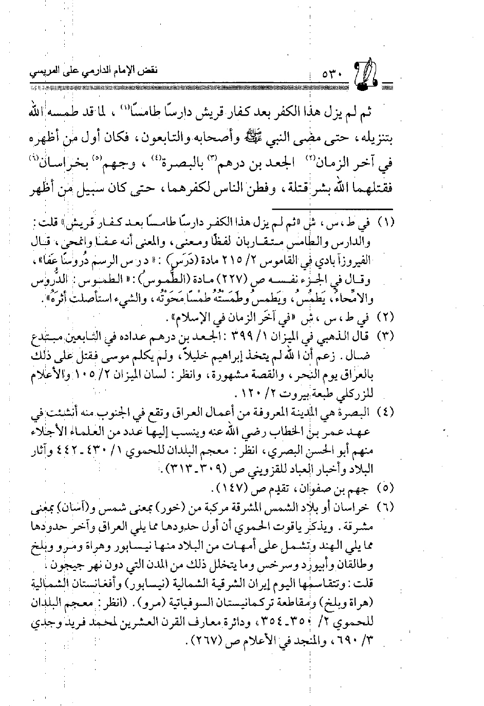 ثُمَّ لَمْ يَزَلْ هَذَا الْكُفْرُ بَعْدَ كُفَّارِ قُرَيْشٍ دَارِسًا طَامِسًا1، لَمَّا قَدْ طَمَسَهُ اللَّهُ بِتَنْزِيلِهِ، حَتَّى مَضَى النَّبِيُّ صَلَّى اللَّهُ عَلَيْهِ وَسَلَّمَ وَأَصْحَابُهُ وَالتَّابِعُونَ، فَكَانَ أَوَّلَ مَنْ أَظْهَرَهُ فِي آخِرِ الزَّمَانِ2 الْجَعْدُ بْنُ دِرْهَمٍ3 بِالْبَصْرَةِ4، وَجَهْمٌ5 بِخُرَاسَانَ6 فَقَتَلَهُمَا اللَّهُ بِشَرِّ قِتْلَةٍ، وَفَطِنَ النَّاسُ لِكُفْرِهِمَا، حَتَّى كَانَ سَبِيل من أظهر