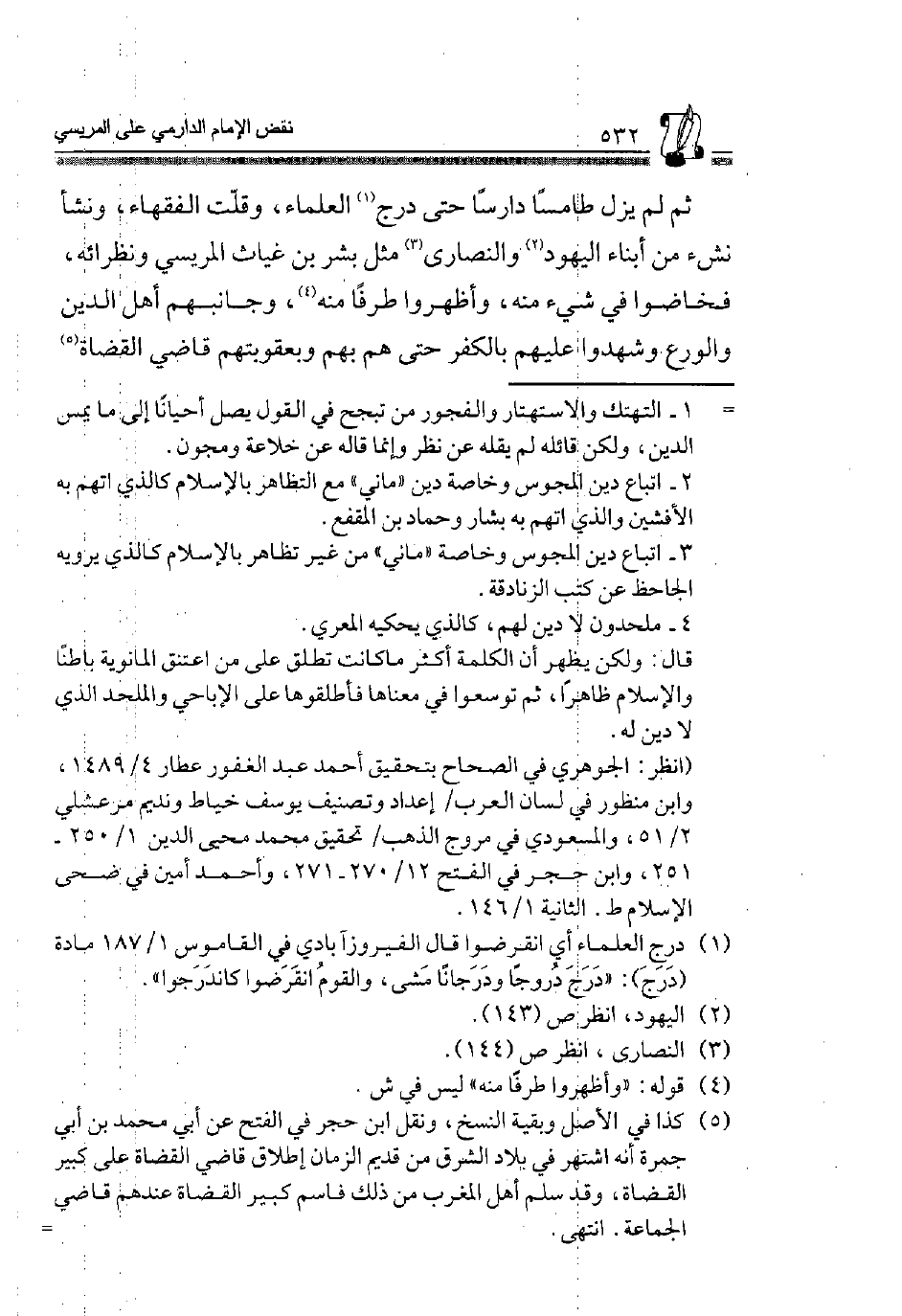 ثُمَّ لَمْ يَزَلْ طَامِسًا دَارِسًا حَتَّى دَرَجَ1 الْعُلَمَاءُ، وَقَلَّتِ الْفُقَهَاءُ، وَنَشَأَ نَشْءٌ مِنْ أَبْنَاءِ الْيَهُودِ2 وَالنَّصَارَى3 مِثْلُ بِشْرِ بْنِ غِيَاثٍ الْمَرِيسِيِّ وَنُظَرَائِهِ فَخَاضُوا فِي شَيْءٍ مِنْهُ، وَأَظْهَرُوا طَرَفًا مِنْهُ4، وَجَانَبَهُمْ أَهْلُ الدِّينِ وَالْوَرَعِ وَشَهِدُوا عَلَيْهِمْ بِالْكُفْرِ حَتَّى هَمَّ بِهِمْ وَبِعُقُوبَتِهِمْ قَاضِي الْقُضَاة5