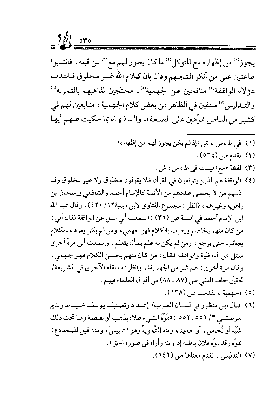 4 الواقفة هم الَّذين يتوقفون فِي الْقُرْآن فَلَا يَقُولُونَ مَخْلُوق ولاغير مَخْلُوق وَقد ذمهم من لَا يُحْصى عَددهمْ من الْأَئِمَّة، كَالْإِمَامِ أَحْمد وَالشَّافِعِيّ وَإِسْحَاق بن رَاهْوَيْةِ وَغَيرهم، "انْظُر: مَجْمُوع الْفَتَاوَى لِابْنِ تَيْمِية 12/ 420"، وَقَالَ عبد الله بن الإِمَام أَحْمد فِي السّنة ص"36": "سَمِعت أبي سُئِلَ عَن الواقفة فَقَالَ أبي: من كَانَ مِنْهُم يُخَاصم وَيعرف بالْكلَام فَهُوَ جهمي، وَمن لم يكن يعرف بالْكلَام يجانب حَتَّى يرجع، وَمن لم يكن لَهُ علم يسْأَل يتَعَلَّم. وَسمعت أبي مرّة أُخْرَى سُئِلَ عَن اللفظية والواقفة فَقَالَ: من كَانَ مِنْهُم يحسن الْكَلَام فَهُوَ جهمي. وَقَالَ مرّة أُخْرَى: هم شَرّ من الْجَهْمِية"، وَانْظُر: مَا نَقله الْآجُرِيّ فِي الشَّرِيعَة تَحْقِيق حَامِد الفقي ص"87-88" من أَقْوَال الْعلمَاء فيهم.