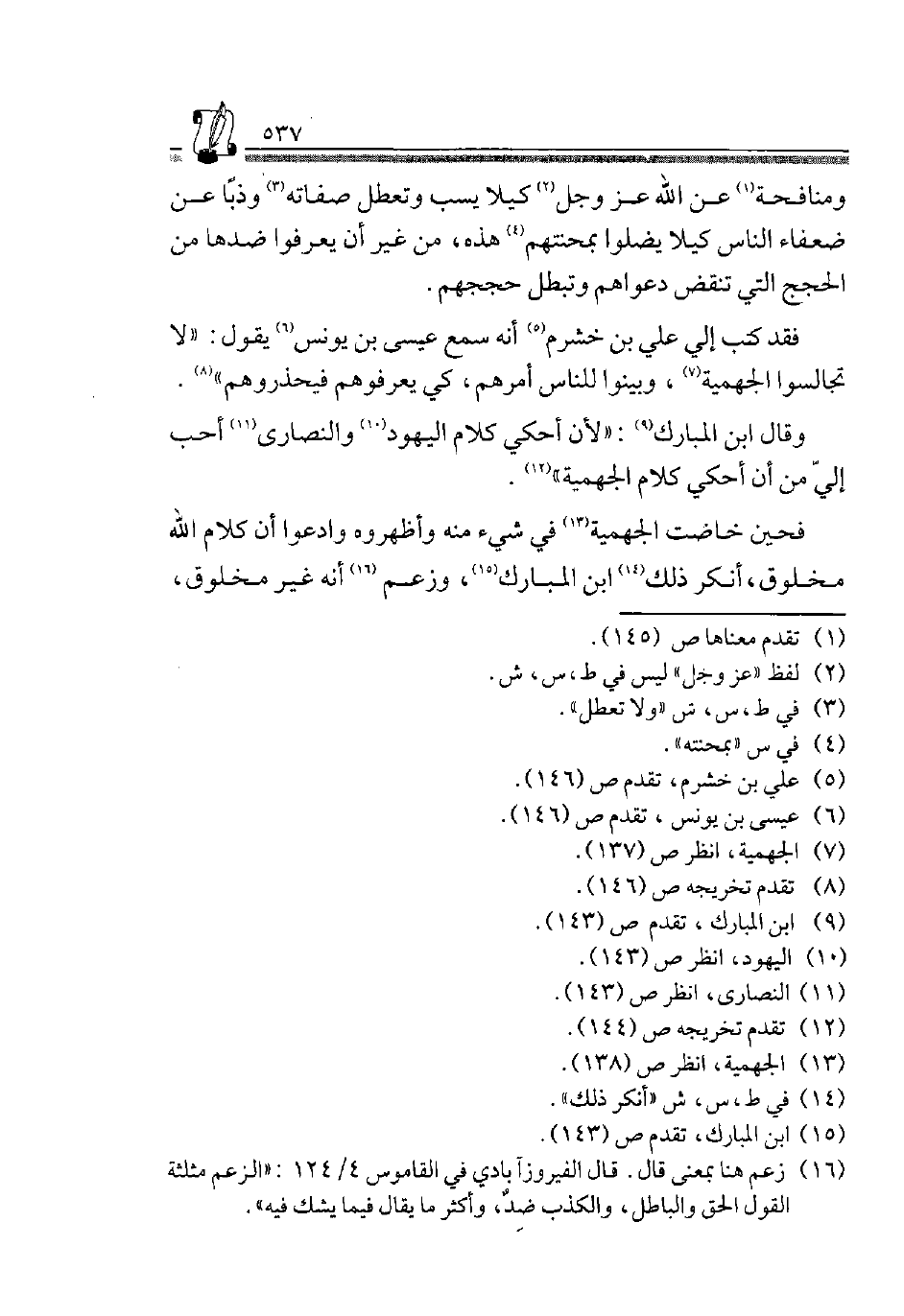 وَقَالَ ابْنُ الْمُبَارَكِ9: "لَأَنْ أَحْكِيَ كَلَامَ الْيَهُودِ10 وَالنَّصَارَى11 أَحَبُّ إِلَيَّ مِنْ أَنْ أَحْكِيَ كَلَامَ الْجَهْمِيَّةِ"12.