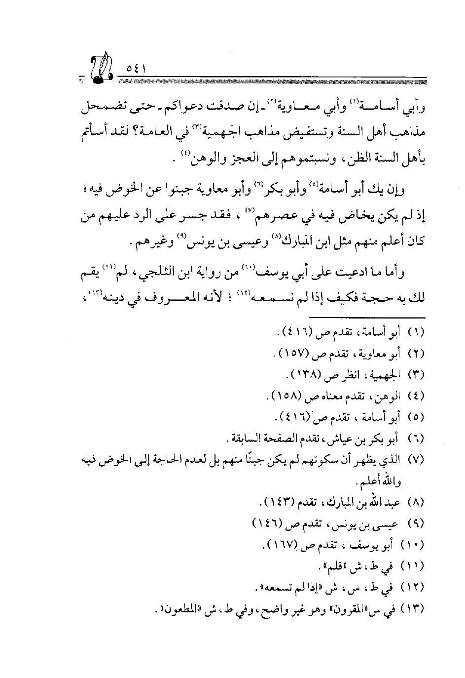 وَإِنْ يَكُ أَبُو أُسَامَةَ5 وَأَبُو بَكْرٍ6 وَأَبُو مُعَاوِيَةَ جَبُنُوا عَنِ الْخَوْضِ فِيهِ، إِذْ لَمْ يَكُنْ يُخَاضُ فِيهِ فِي عَصْرِهِمْ7، فَقَدْ جَسَرَ عَلَى الرَّدِّ عَلَيْهِمْ مَنْ كَانَ أَعْلَمَ مِنْهُمْ مِثْلَ ابْنِ الْمُبَارَكِ8 وَعِيسَى بْنِ يُونُسَ9 وَغَيْرِهِمْ.