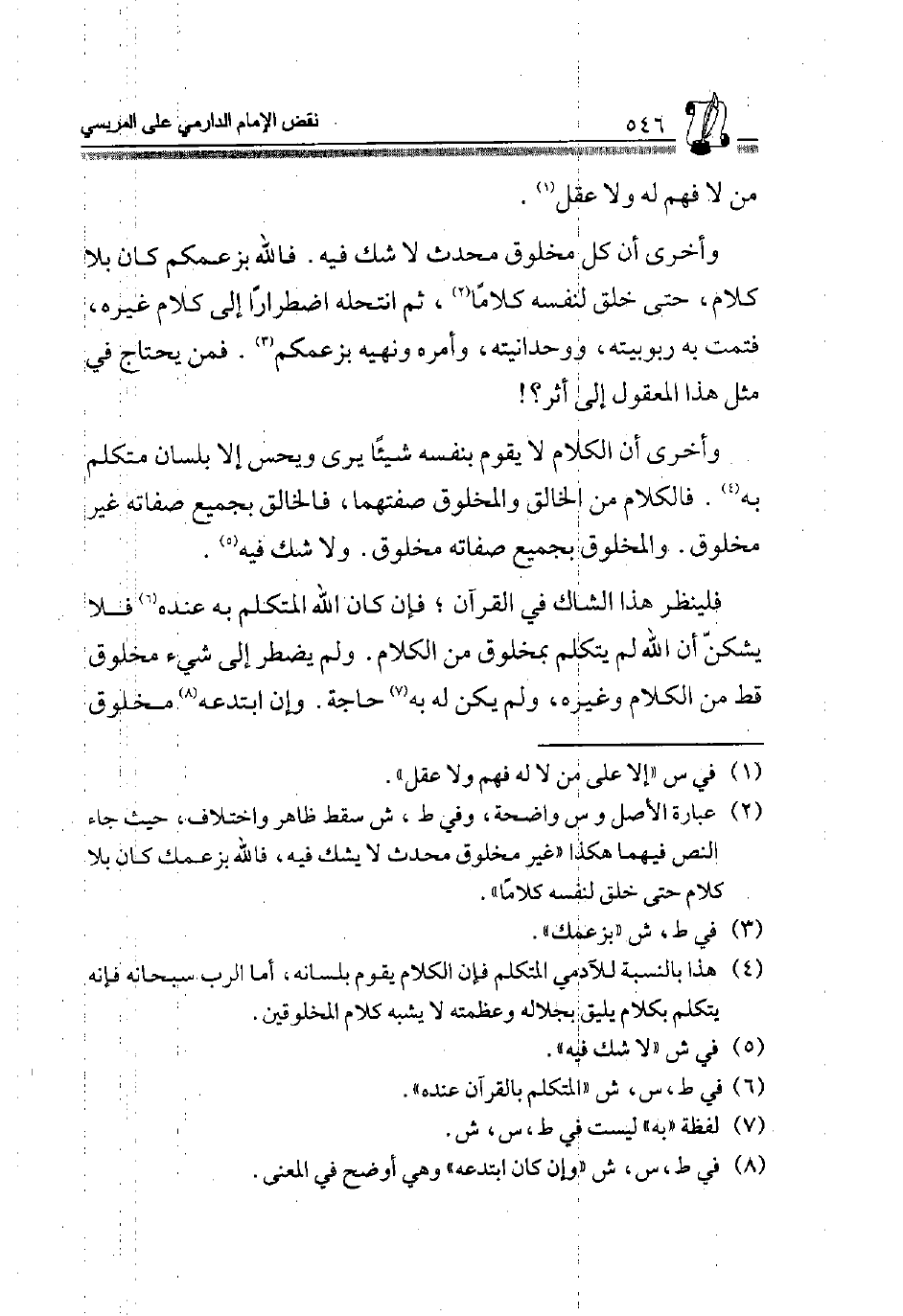 وَأُخْرَى أَنَّ كُلَّ مَخْلُوقٍ مُحْدَثٍ لَا شَكَّ فِيهِ. فَاللَّهُ بِزَعْمِكُمْ كَانَ بِلَا كَلَامٍ، حَتَّى خَلَقَ لِنَفْسِهِ كَلَامًا2، ثُمَّ انْتَحَلَهُ اضْطِرَارًا إِلَى كَلَامِ غَيْرِهِ، فَتَمَّتْ بِهِ رُبُوبِيَّتُهُ، وَوَحْدَانِيَّتُهُ، وَأَمْرُهُ وَنَهْيُهُ بِزَعْمِكُمْ3. فَمَنْ يَحْتَاجُ فِي مِثْلِ هَذَا الْمَعْقُول إِلَى أَثَرٍ؟!