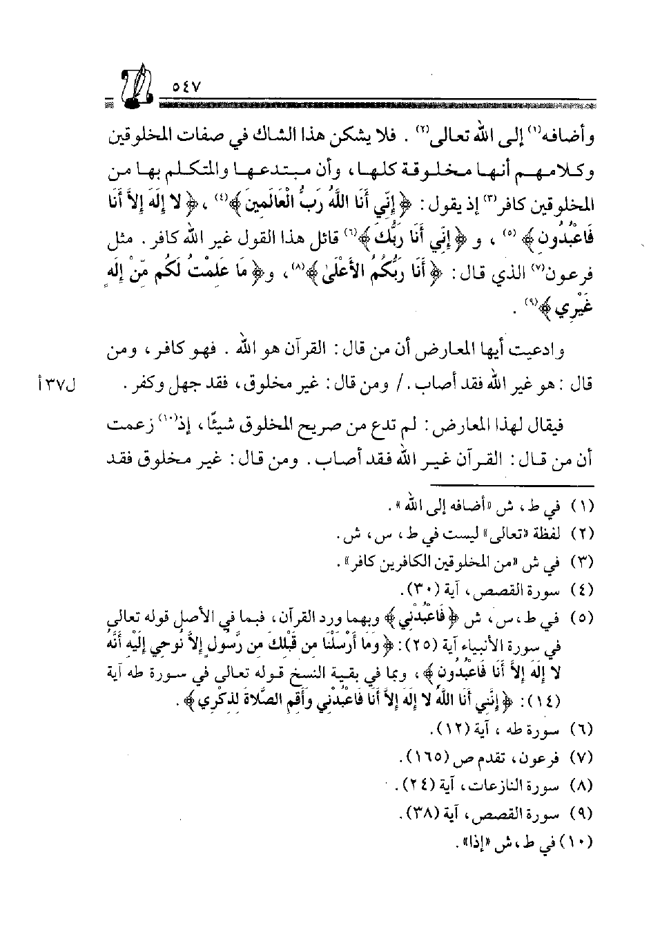 5 فِي ط، س، ش {فَاعْبُدْنِي} وَبِهِمَا ورد الْقُرْآن، فبمَا فِي الأَصْل قَوْله تَعَالَى فِي سُورَة الْأَنْبِيَاء آيَة 25: {وَمَا أَرْسَلْنَا مِنْ قَبْلِكَ مِنْ رَسُولٍ إِلاَّ نُوحِي إِلَيْهِ أَنَّهُ لَا إِلَهَ إِلاَّ أَنَا فَاعْبُدُونِ} ، وَبِمَا فِي بَقِيَّة النّسخ قَوْله تَعَالَى فِي سُورَة طه آيَة 14: {إِنَّنِي أَنَا اللَّهُ لَا إِلَهَ إِلاَّ أَنَا فَاعْبُدْنِي وَأَقِمُ الصَّلاةَ لِذِكْرِي} .