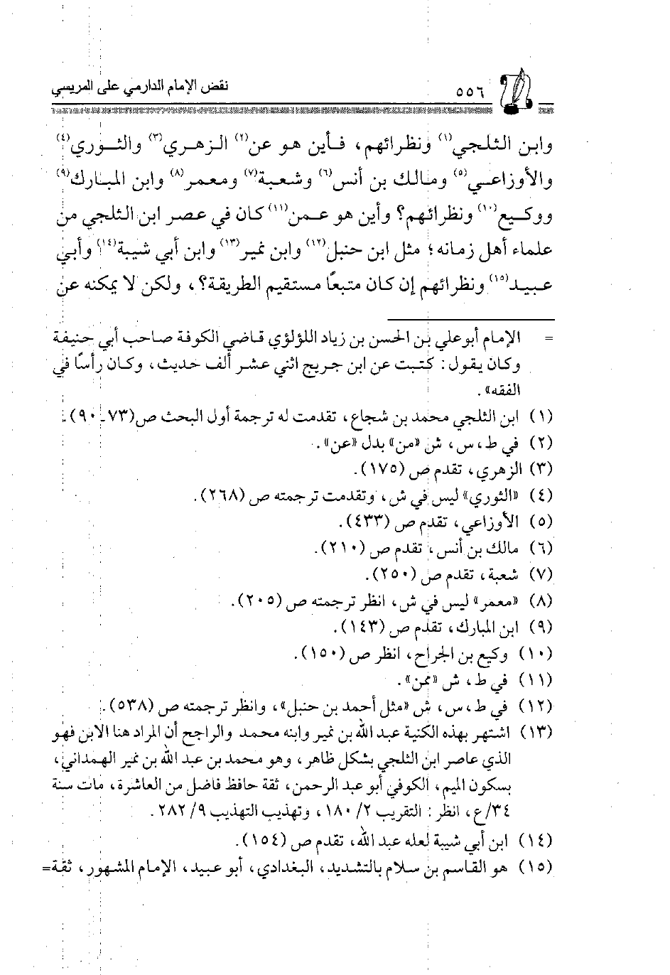 وَابْنِ الثَّلْجِيِّ1 وَنُظَرَائِهِمْ، فَأَيْنَ هُوَ عَنِ2 الزُّهْرِيِّ3 وَالثَّوْرِيِّ4 وَالْأَوْزَاعِيِّ5، وَمَالِكِ بْنِ أَنَسٍ6 وَشُعْبَةَ7 وَمَعْمَرٍ8 وَابْنِ الْمُبَارَكِ9 وَوَكِيعٍ10 وَنُظَرَائِهِمْ؟ وَأَيْنَ هُوَ عَمَّنْ11 كَانَ فِي عَصْرِ ابْنِ الثَّلْجِيِّ مِنْ عُلَمَاءِ أَهْلِ زَمَانِهِ، مِثْلِ ابْنِ حَنْبَلٍ12 وَابْنِ نُمَيْرٍ13 وَابْنِ أَبِي شَيْبَةَ14 وَأَبِي عُبَيْدٍ15 وَنُظَرَائِهِمْ إِنْ كَانَ مُتَّبِعًا مُسْتَقِيمَ الطَّرِيقَةِ؟، وَلَكِنْ لَا يُمْكِنُهُ عَنْ