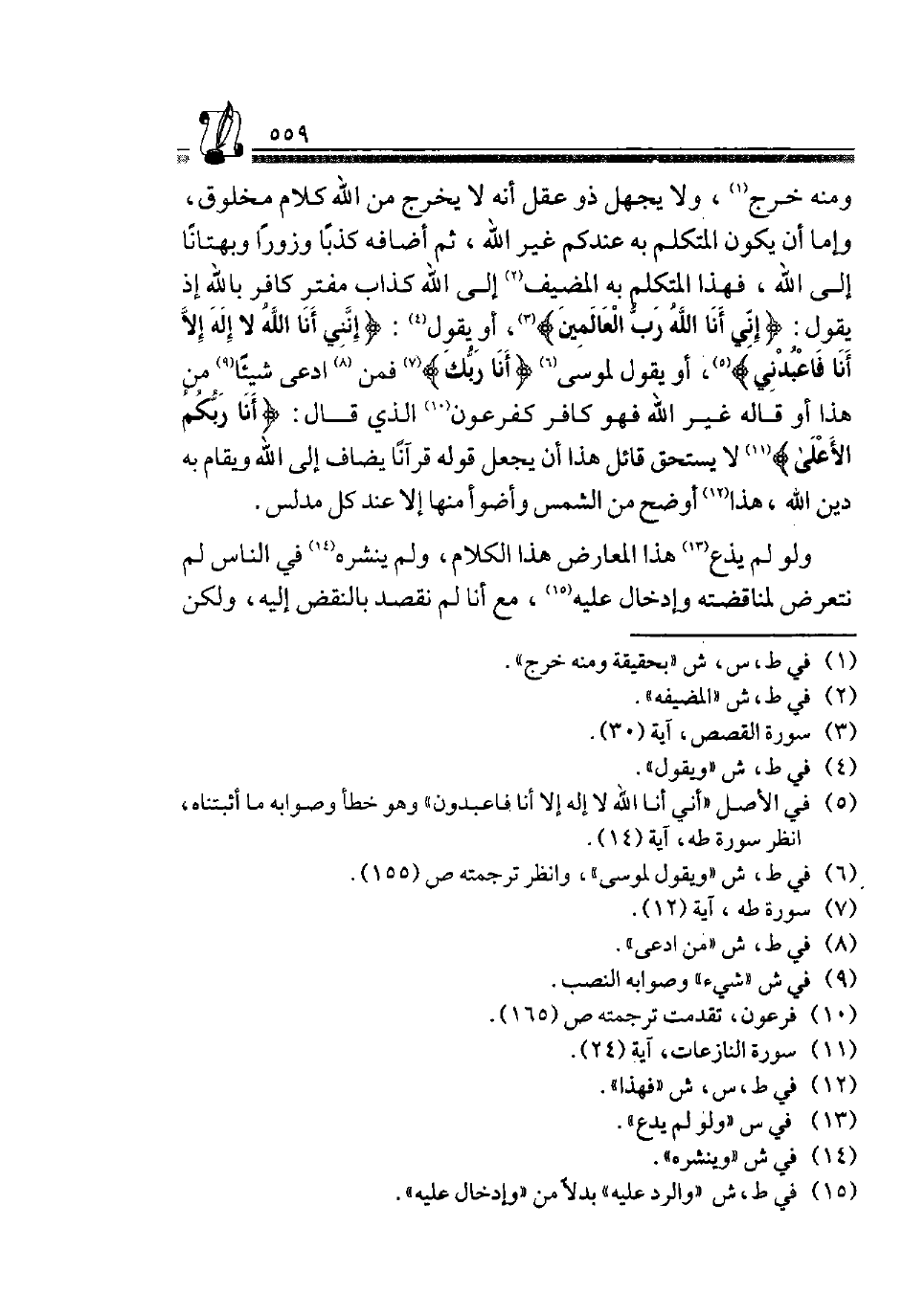 وَمِنْهُ خَرَجَ1، وَلَا يَجْهَلُ ذُو عَقْلٍ أَنَّهُ لَا يَخْرُجُ مِنَ اللَّهِ كَلَامٌ مَخْلُوقٌ، وَإِمَّا أَنْ يَكُونَ الْمُتَكَلِّمُ بِهِ عِنْدَكُمْ غَيْرَ اللَّهِ، ثُمَّ أَضَافَهُ كَذِبًا وَزُورًا وَبُهْتَانًا إِلَى اللَّهِ، فَهَذَا الْمُتَكَلِّمُ بِهِ الْمُضِيفُ2 إِلَى اللَّهِ كَذَّابٌ مُفْتَرٍ كَافِرٌ، بِاللَّهِ إِذْ يَقُولُ: {إِنِّي أَنَا اللَّهُ رَبُّ الْعَالَمِين} 3، أويقول4: {إِنَّنِي أَنَا اللَّهُ لَا إِلَهَ إِلاَّ أَنَا فَاعْبُدْنِي} 5، أَوْ يَقُولُ لِمُوسَى6 {أَنَا رَبُّك} 7 فَمَنِ8 ادَّعَى شَيْئًا9 مِنْ هَذَا أَوْ قَالَهُ غَيْرُ اللَّهِ فَهُوَ كَافِرٌ كَفِرْعَوْنَ10 الَّذِي قَالَ: {أَنَا رَبُّكُمُ الأَعْلَى} 11 لَا يَسْتَحِقُّ قَائِلُ هَذَا أَنْ يَجْعَلَ قَوْلَهُ قُرْآنًا يُضَافُ إِلَى اللَّهِ وَيُقَامُ بِهِ دِينُ اللَّهِ12 أَوْضَحُ مِنَ الشَّمْسِ وَأَضْوَأُ مِنْهَا إِلَّا عِنْدَ كُلِّ مُدَلِّسٍ.