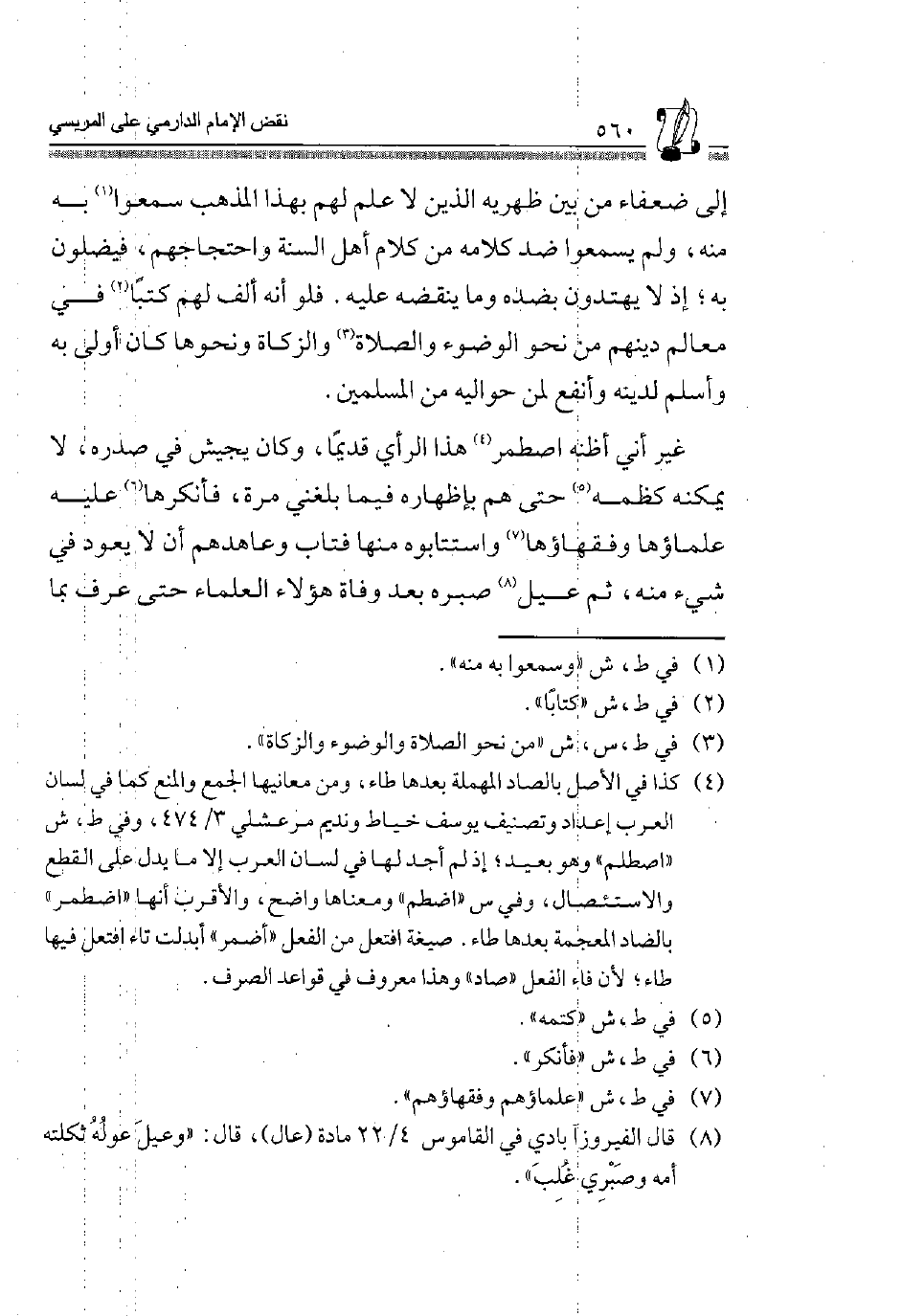 4 كَذَا فِي الأَصْل بالصَّاد الْمُهْملَة بعْدهَا طاء, وَمن مَعَانِيهَا الْجمع وَالْمَنْع كَمَا فِي لِسَان الْعَرَب إعداد وتصنيف يُوسُف خياط ونديم مرعشلي 3/ 474، وَفِي ط، ش "اصطلم" وَهُوَ بعيد، إِذْ لم أجد لَهَا فِي لِسَان الْعَرَب إِلَّا مَا يدل على الْقطع والاستئصال، وَفِي س "اضطم" وَمَعْنَاهَا وَاضح، وَالْأَقْرَب أَنَّهَا "اضطمر" بالضاد الْمُعْجَمَة بعْدهَا طاء. صِيغَة افتعل من الْفِعْل "أضمر" أبدلت تَاء افتعل فِيهَا طاء؛ لِأَن فَاء الْفِعْل "صَاد" وَهَذَا مَعْرُوف فِي قَوَاعِد الصّرْف.